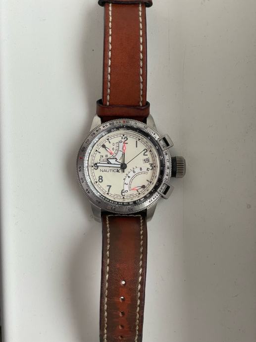 Prodajem rabljeni Nautica Flyback chronograph sat model NAI24504G s kožnim remenom smeđe boje. Elegantni muški sat ima impresivno bijelo brojčano polje s chronograph funkcijama i kvalitetnim metalnim kućištem. Sat je u dobrom stanju, idealan za svakodnevno nošenje ili kao dodatak formalnom outfitu.