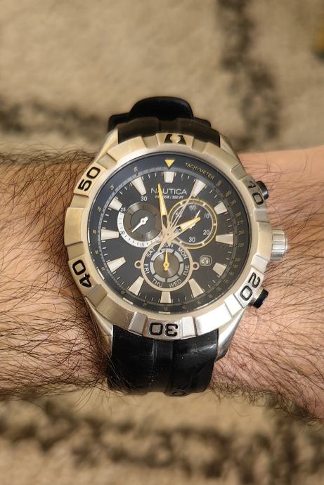 Prodajem rabljeni Nautica sat s klizečom kazaljkom koji se ističe svojim elegantnim dizajnom. Sat dolazi sa dva remena crnim i naranđastim.