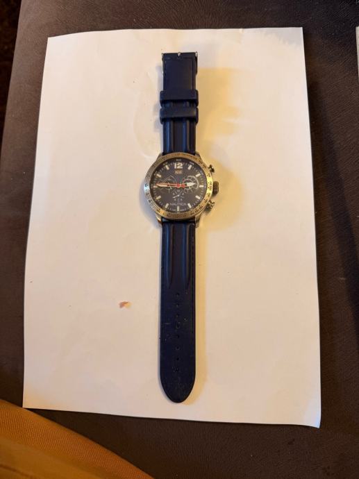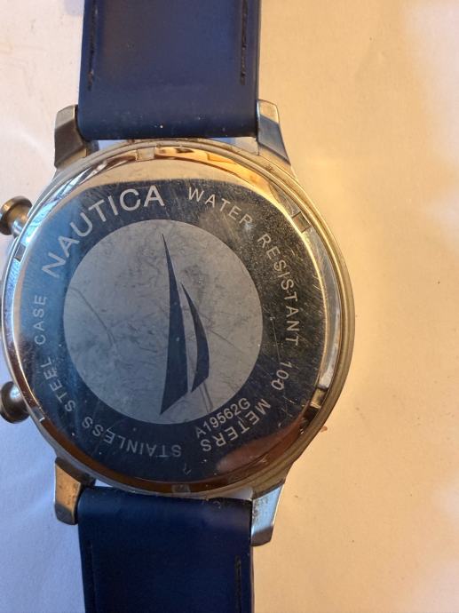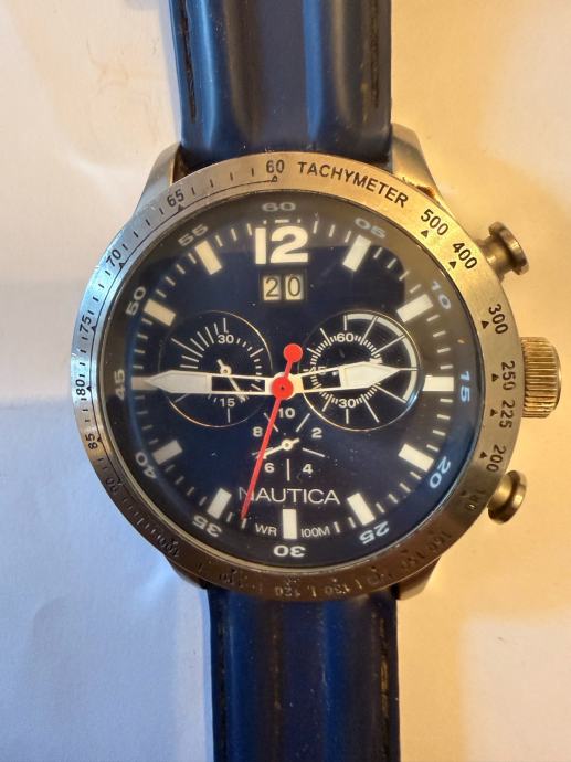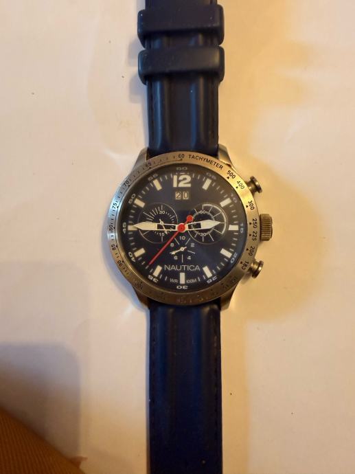 Prodajem muški Nautica sat s kronografom u tamno plavoj boji. Radi se o modelu s tahimetarskom ljestvicom na okviru, tamno plavim brojčanikom i gumenom narukvicom iste boje. Sat ima više brojčanika za mjerenje vremena te karakteristične crvene kazaljke koje ga čine lako čitljivim. Vodootporan je do 100 metara (WR 100M). Kućište je srebrne boje od nehrđajućeg čelika, a sat je solidnih, muževnih dimenzija.