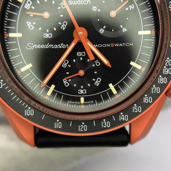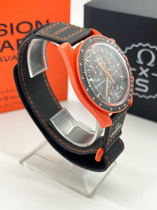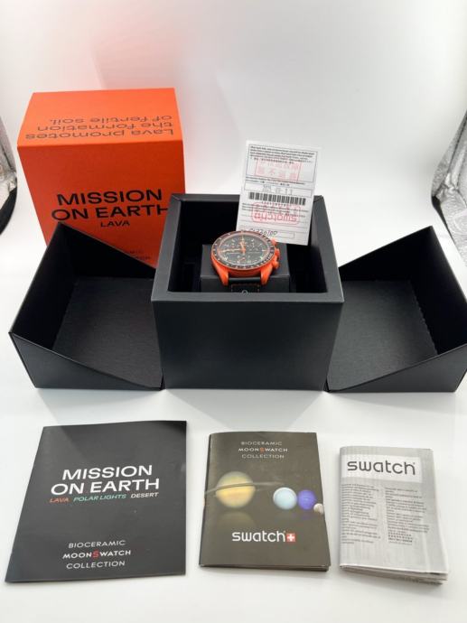 Prodajem Omega x Swatch MoonSwatch "Mission on Earth – Lava" iz Bioceramic MoonSwatch kolekcije. Radi se o kronografu s narančastim biokeramičkim kućištem i crnim brojčanikom s narančastim detaljima. Remen je crni s narančastim šivanjem i Omega logotipom. Sat dolazi s originalnim kutijama. Samo poziv