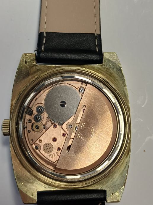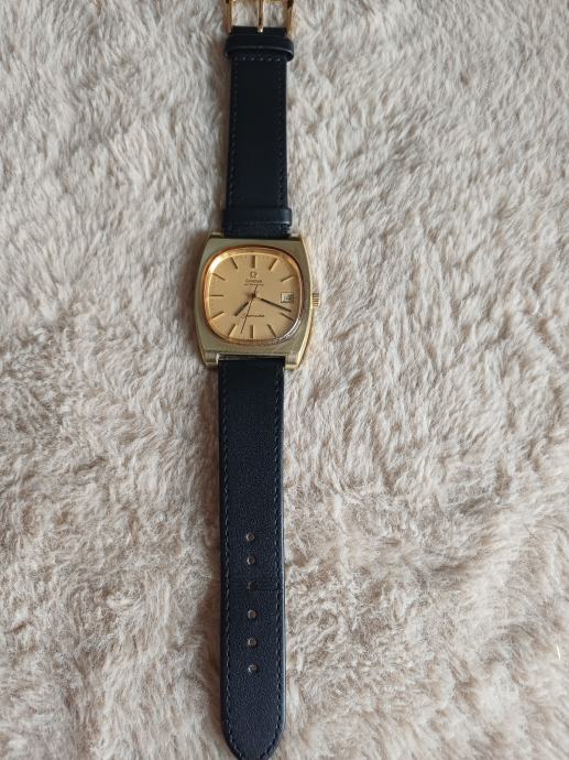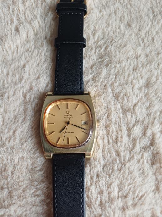 Omega Seamaster Automatic sat sa pozlaćenim kućištem, datumskom funkcijom i crnim kožnim remenom.