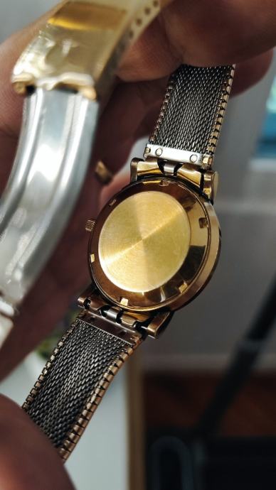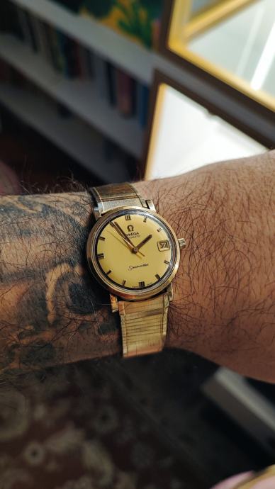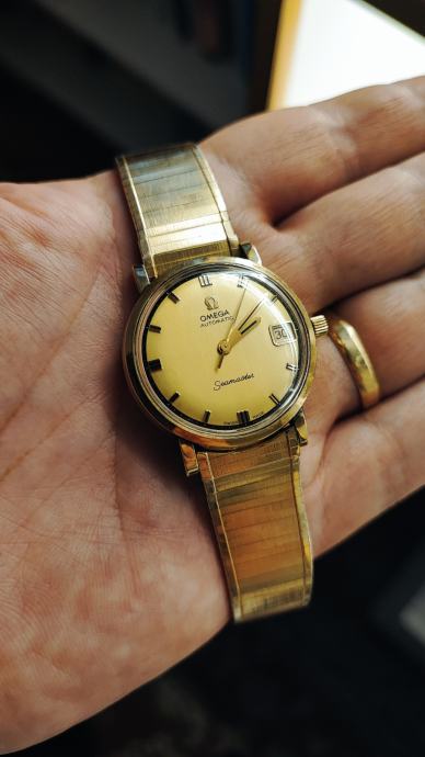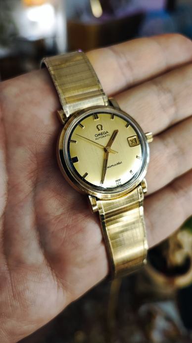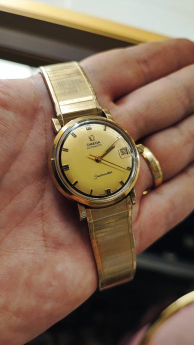 Omega Seamaster iz 70tih godina iz limitirane serija US Collections (1971 - 1975) Sat pokreće Omega automatski mehanizam cal. 563 koji radi precizno i točno, te je u fantastičnom radnom stanju. Sat je i estetski u odličnom stanju, prelijepo kućište veličine 34mm je punjeno 10k zlatom, zlatni cifer sa crnim rubom bez točkice, kazaljke fenomenalne. Sat je u potpuno originalnom stanju, potpisana krunica, a najrijeđi dio priče je originalna Omega Champion flat link pozlaćena narukvica koja je pogodna za zglob do 18.5cm. Uz sat dolaze i dvije kožne narukvice sa omega kopčom, te originalna kutija. Jako rijetko viđen ovakav paket za ovu verziju sata, fantastičan primjerak.