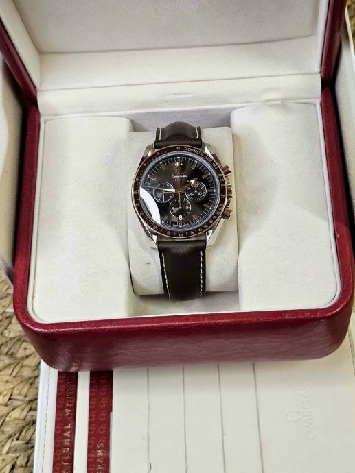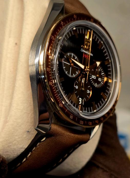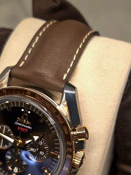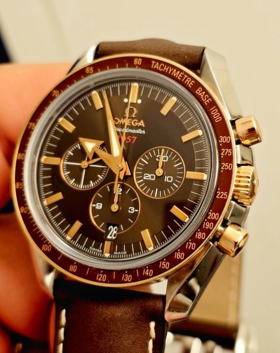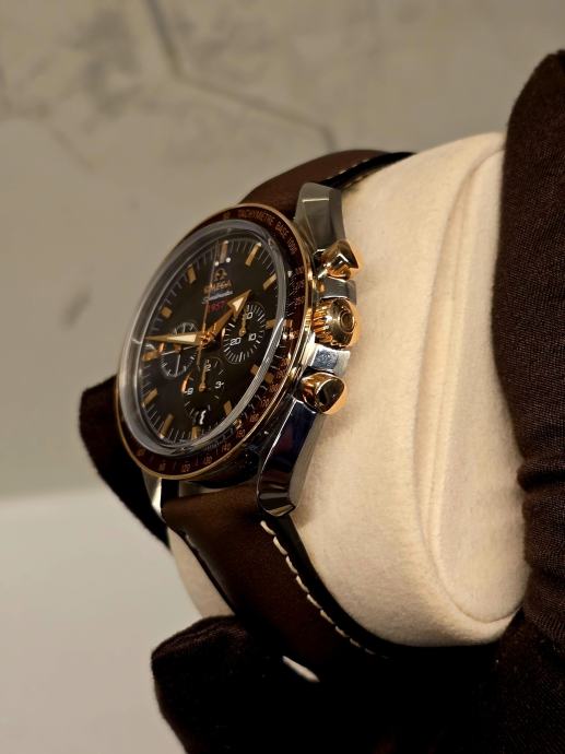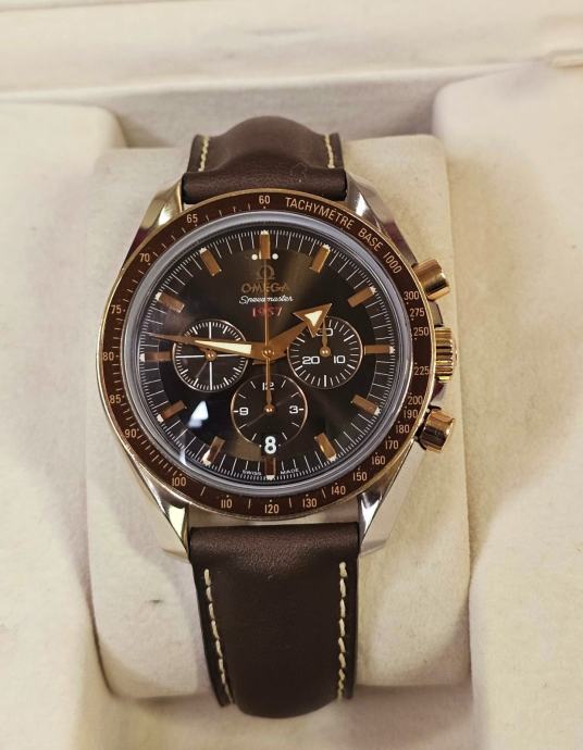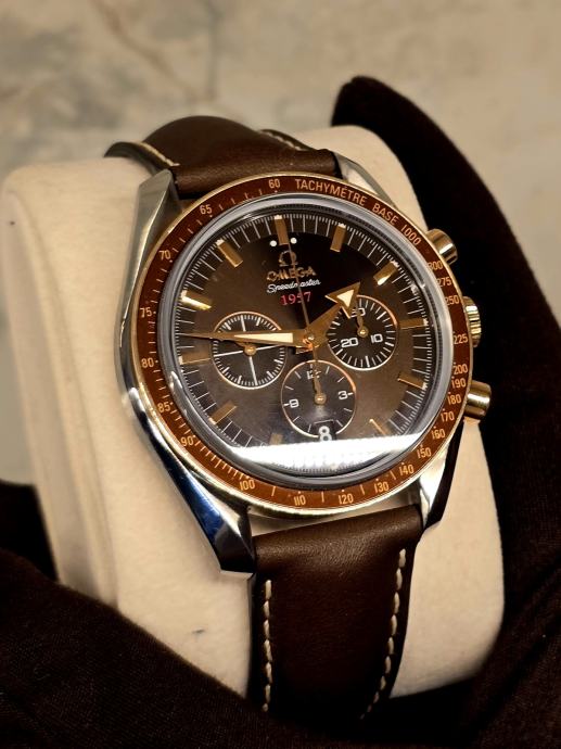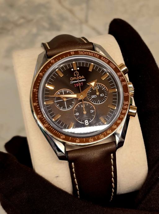 Prekrasan i elegantan primjerak legendarnog Speedmastera inspiriranog originalom iz 1957. godine. Posebno se ističe toplim smeđim brojčanikom i luksuznim zlatnim detaljima na luneti, krunici i indeksima, koji satu daju profinjen i vrlo upečatljiv izgled na ruci.