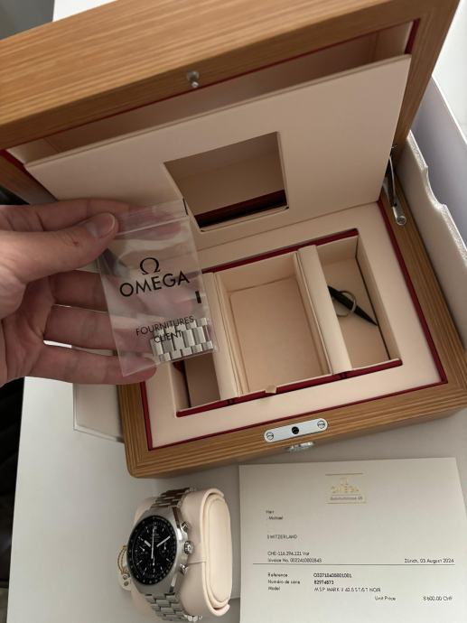 Sat je kupljen 3 kolovoza 2024 službenom Omega butike u Zürichu (Bahnhofstrasse)te je pod punom međunarodnom tvorničkom garancijom do 2029.godine.