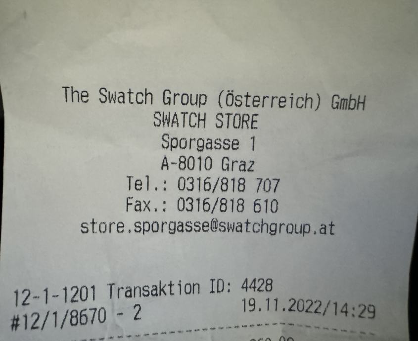 Sat je kupljen 19.11.2022. u Swatch storeu u Grazu, garancija je aktivna 2 godine.