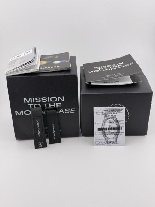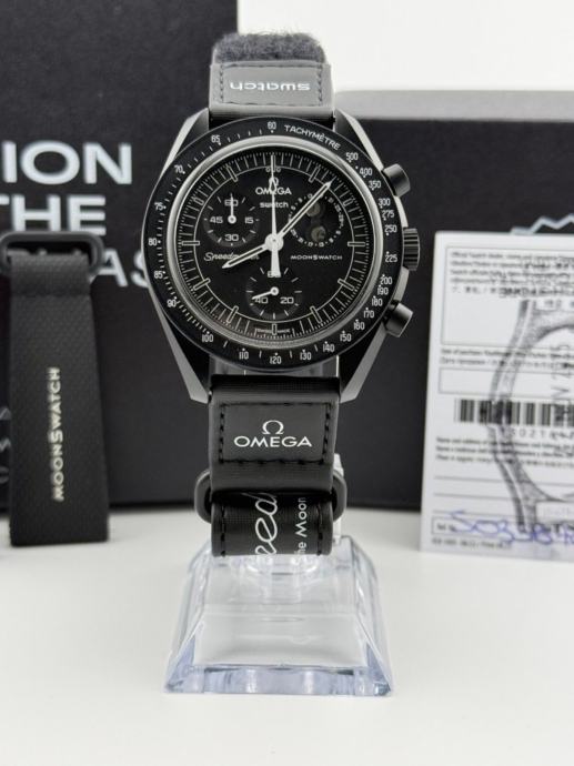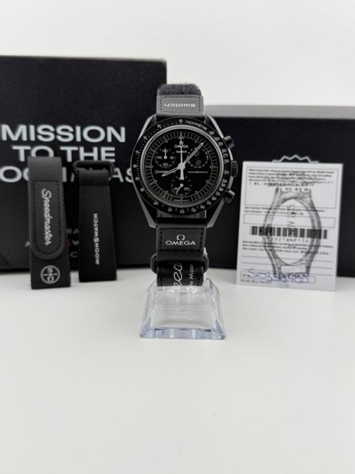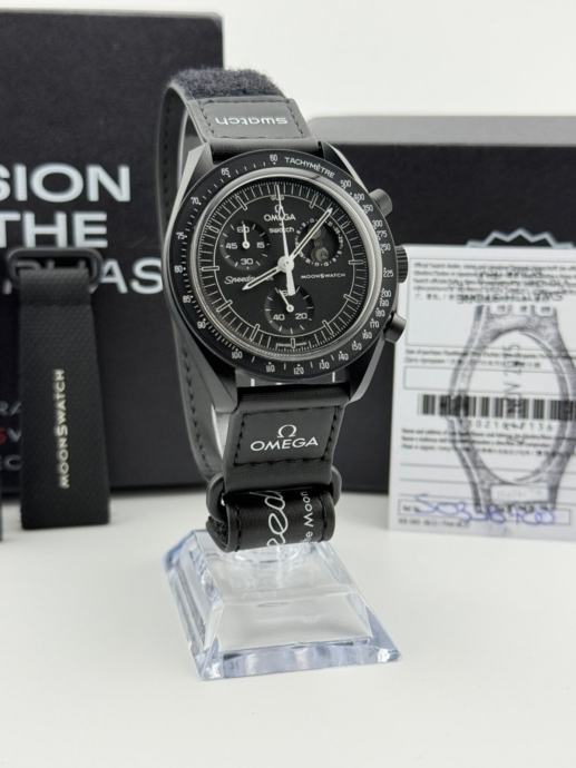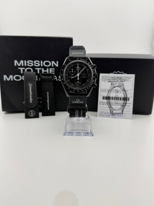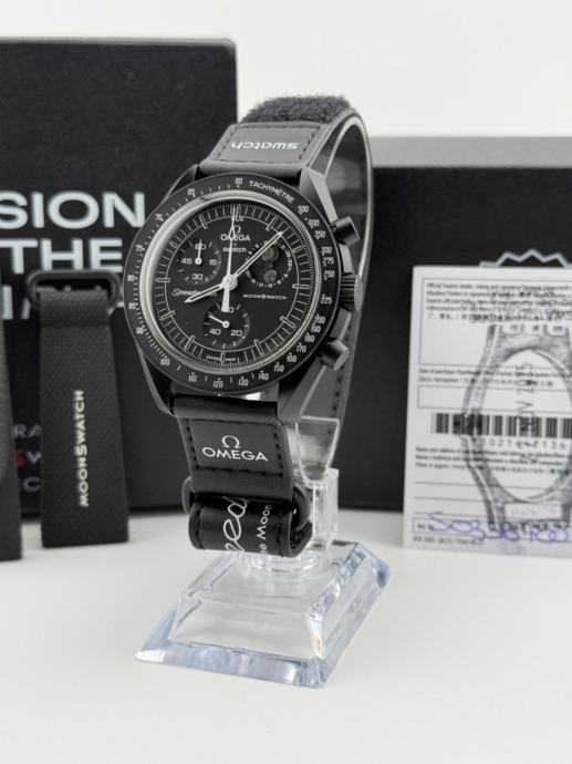 Prodajem Omega x Swatch Speedmaster MoonSwatch u crnoj boji, Mission to the Moon verzija. Radi se o kronografu s crnim brojčanikom i tachymetre ljestvicom na luneti. Sat dolazi s crnim tekstilnim remenom s Omega natpisom, dodatnim sivim remenom te originalnom kutijom i pratećom dokumentacijom.