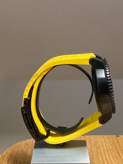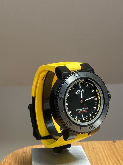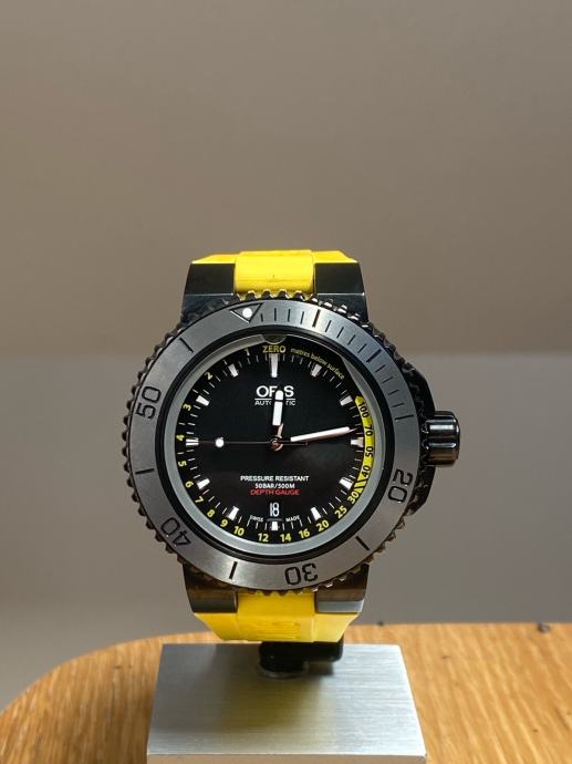 Prodajem nov Oris Aquis Depth Gauge ronilački sat s etiketom. Radi se o specifičnom modelu s ugrađenim mehaničkim mjeračem dubine, jednoj od najzanimljivijih funkcija u svijetu ronilačkih satova. Kućište je izrađeno u crnoj titanovoj izvedbi, s jednosmjernim rotirajućim lunettom. Sat ima crni brojčanik s luminoscentnim indeksima i kazaljkama za izvrsnu vidljivost pod vodom. Dolazi na upečatljivoj žutoj gumiranoj narukvici koja je otporna na slanu vodu i idealna za ronjenje. Vodootpornost je prilagođena ronjenju na velike dubine. Mehanizam mjerača dubine mehanički bilježi maksimalnu dostignutu dubinu tijekom zarona. Sat je u potpuno novom stanju.