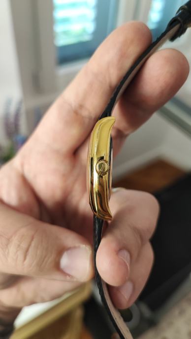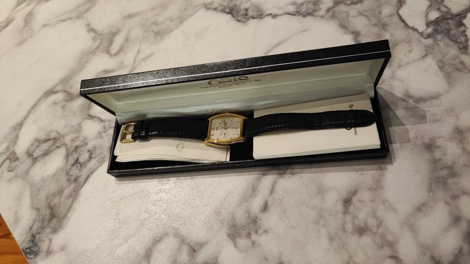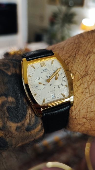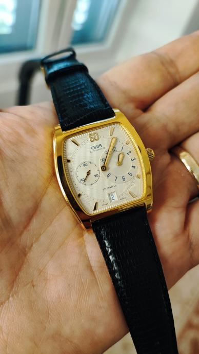 Oris Tonneau Regulator iz 1995. Pokreće ga Oris cal. 649 automatski mehanizam koji je u izvrsnom radnom stanju, precizan i točan. Sat je estetski u odličnom stanju, kućište u pozlati dimenzija 33mm x 38mm, prelijep guilloche cifer, potpisana krunica, originalna kopča. Sat dolazi u punom setu, kutija, papiri, čak i originalni račun od kupovine iz 1995. Izniman kolekcionarski set ovog prekrasnog i rijetkog Orisa.