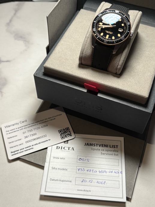 Izvrstan Oris model no 733 7720 4354-07 421.18. Kupljen u Hrvatskoj (Dicta) 12/2022. Full set, vanjska kutija malo oštećena. Sat je kao nov. Promjer sata 42mm. Cijena novog 2350 EUR. Svi satovi su iz moje kolekcije, i svima sam prvi ili drugi vlasnik. Popust za kupnju više satova. Zamjene samo ako uzmete 2 ili više mojih satova za vaš skuplji, ili nudite vaš sat i doplatu.