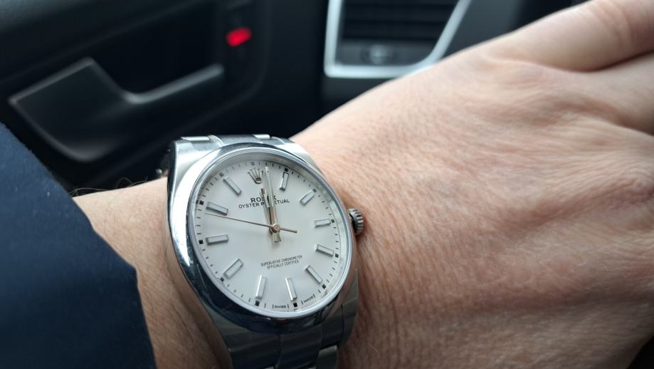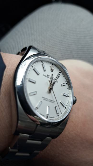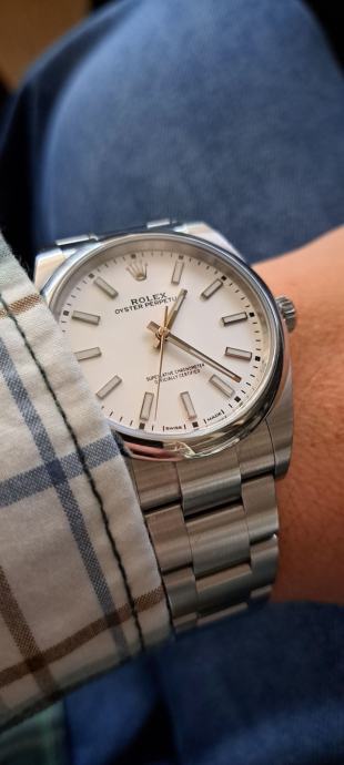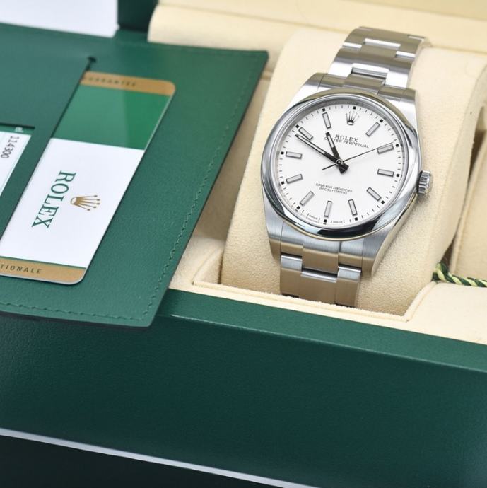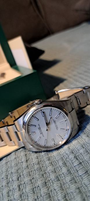 Rijedak, bijeli OP 39 s datumom kupnje iz 2020. g. Ovaj model više nije u Rolexovoj ponudi, a to mu dodaje kolekcionarsku vrijednost. Radi savršeno (do +- 2 sec dnevno, ovisno o položaju), malo nošen. Full set (obje kutije, handtag, kartica, dvije knjižice, etui). Prekrasan bijeli kvadrant (dial) mijenja ton u ovisnosti o izvoru svjetla pa će tako za sunčanog dana na otvorenom imati snježnobijeli odsjaj, dok će se na slabijoj svjetlosti bjelina umiriti. Prekrasan sat za one koji nisu baš skloni razmetanju. Ili, kako kaže reputabilni orološki magazin: