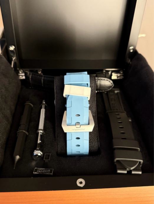 U odličnom stanju, sa tri OEM remena dva koja standardno dolaze s njime- crni kroko 24/22 i crni kaučuk 24/22 te svjetlo plavi accordion kaučuk 24/22 koji mu izvanredno paše. Full set tri kutije, unutarnja kutija je old school drvena, alat za brzo mijenjanje remena i alat za skidanje kopče, uputstvo i NFC kartica.