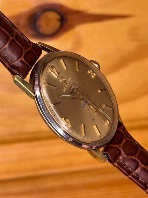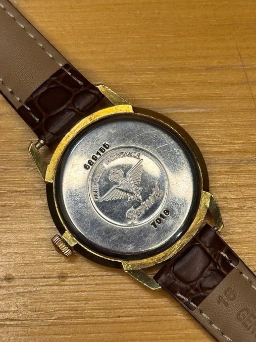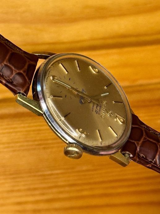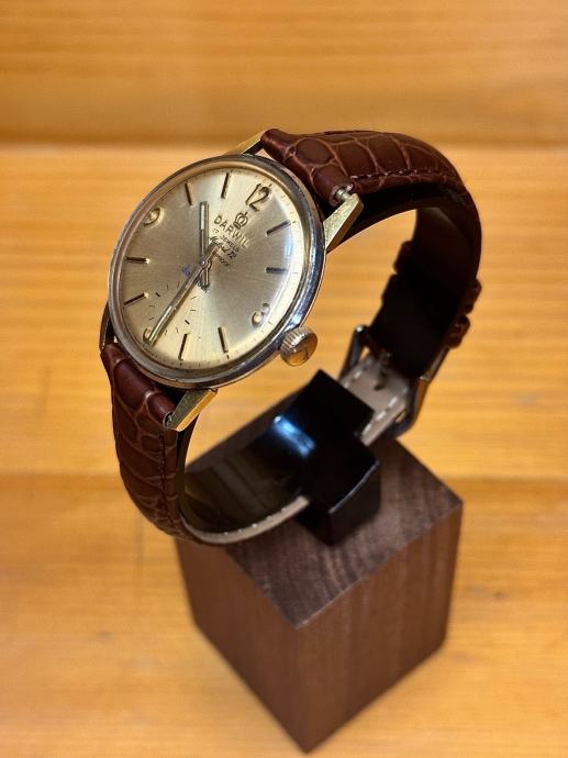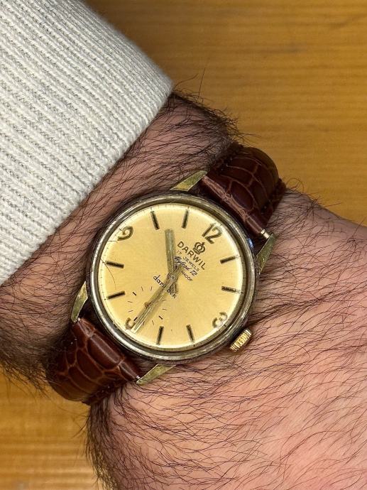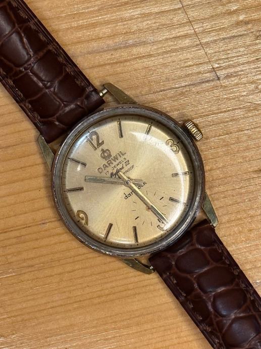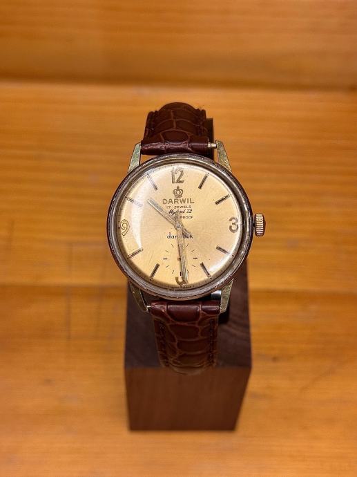 U ponudi jedan sjajan vintage Darwil Mylord sa malom sekundarom. Sat dolazi na novom smeđem kožnom kaišu, a cifer je zlatne boje s plavim ispisom „darblock“ što mu daje jedan lijep detalj. Savršen dress sat (malo ljudi zna da je Darwil ponovno oživljen brend i da u svojoj modernoj ponudi ima model Mylord i to po cijeni od 1650€)