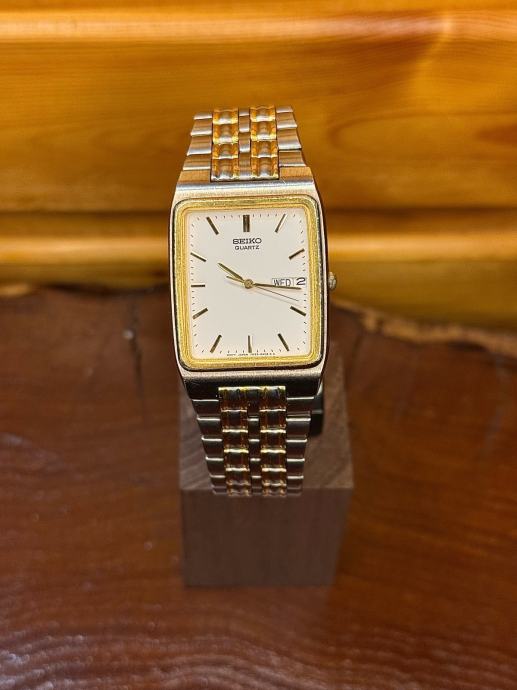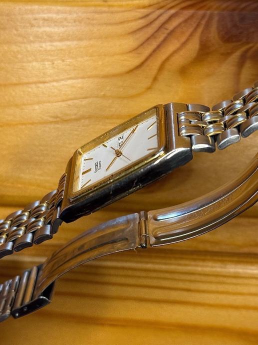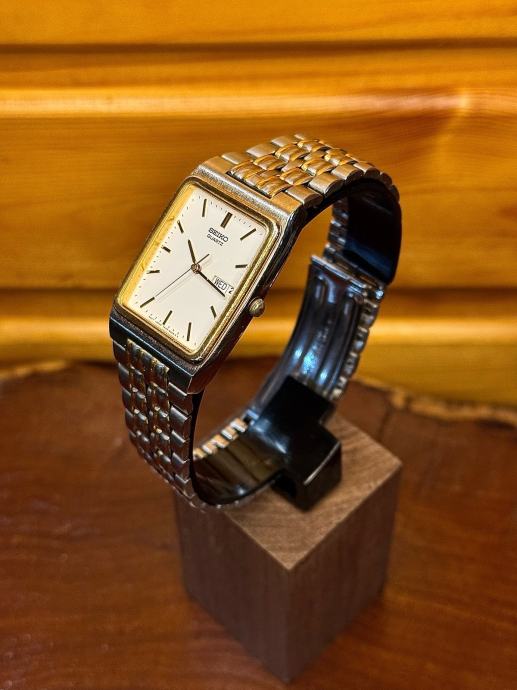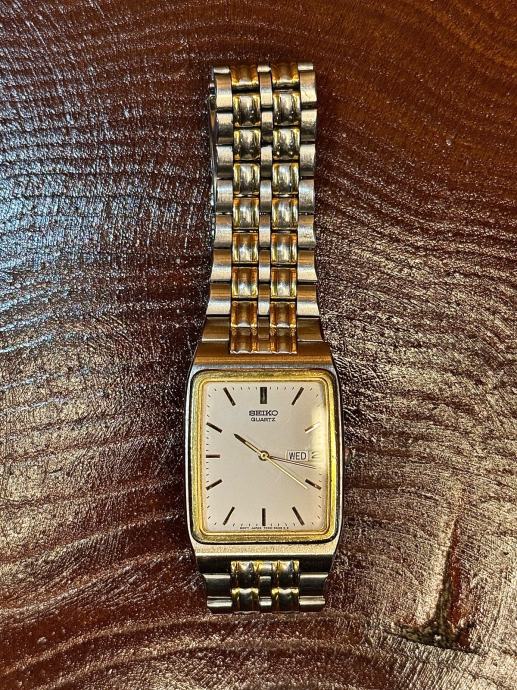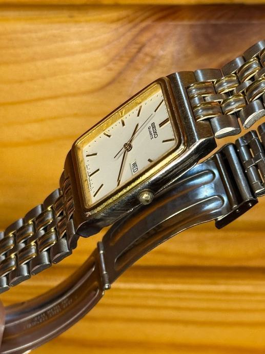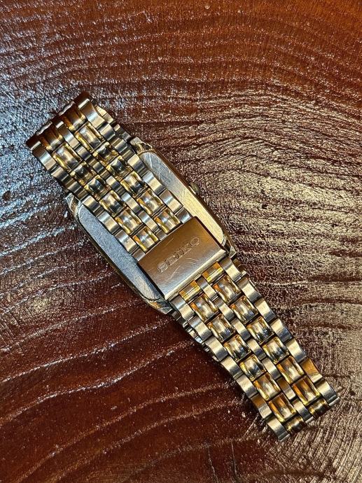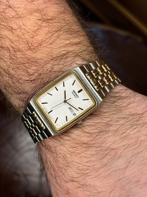 Prodaje se Seiko koji podsjeca na Cartierov kultni Tank. Ovaj primjerak dolazi na originalnoj seiko narukvici u two tone varijanti celik-zuto zlato u odlicnom stanju i pune duzine. Tu je i prelijepi bijeli brojcanik na koje su se smjestile funkcije dana i datuma.