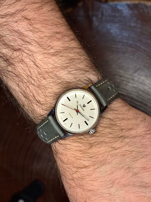 Interesantna Nivada promjera 34 mm. Time only sat s lijepom sunburst završnom obradom na brojčaniku sa zelenim vrhovima na satnoj i minutnoj kazaljki, a sekundara je crvene boje (lijep kontrast). Na sve to lijepo ide sivi kožni racing remen. Odrađen je kompletan servis, a od nedostataka jedino je par točkica mo staklu (vidi slike).