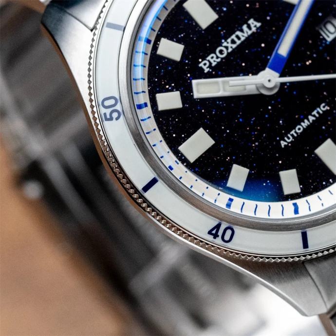 Proxima sa safirnim kristalom, i safirnim lume bezelom sa odličnih 11.5 mm debljine. Metalna narukvica ima quick adjust mehanizam za brzo podešavanje širine.