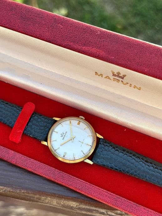 Veoma elegantan Marvin u boji zutog zlata. Mehanizam na rucno navijanje svicarske proizvodnje. Dimenzija kucista je 34 mm u promjeru. Dolazi na crnom koznom kaisu koji mu odlicno stoji. Na bijelom brojcaniku smjestila se mala sekundara koja mu daje lijep detalj na bijelom brojcaniku. Ovaj primjerak takodje dolazi u originalnoj kutiji i u odlicnom je stanju.
