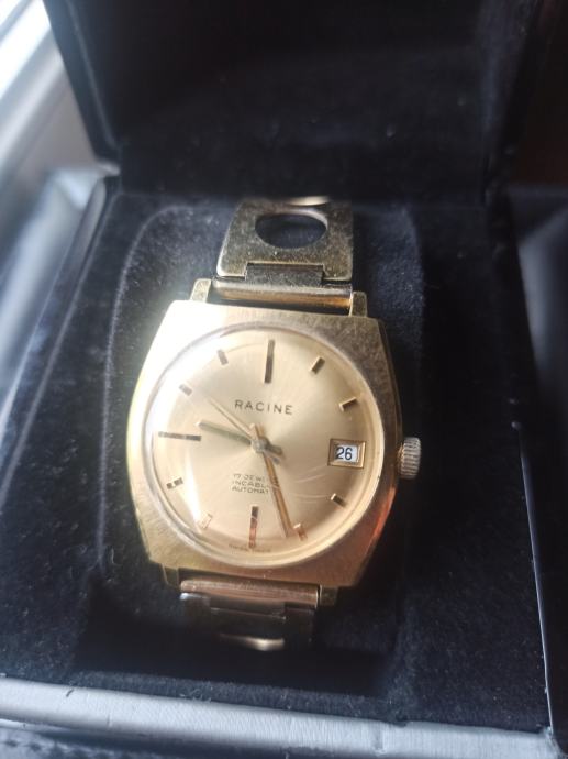 Prodajem RACINE automatic vintage sat s incabloc šok zaštitom. Sat je pozlaćen (rolled gold), proizveden 60.-tih godine prošlog stoljeća i predstavlja kolekcionarsku vrijednost. Promjer stakla je 28 mm, širina prihvata remena je 17,5 mm. Sat je ispravan, neoštećen s normalnim tragovima protoka vremena i korištenja.