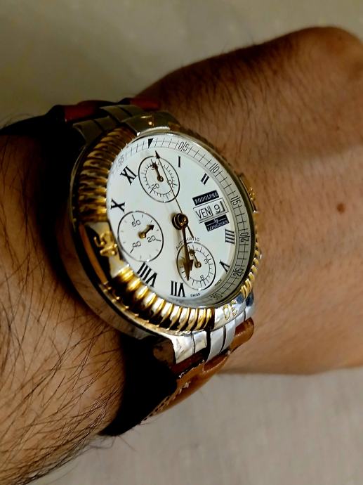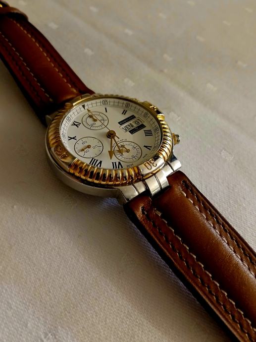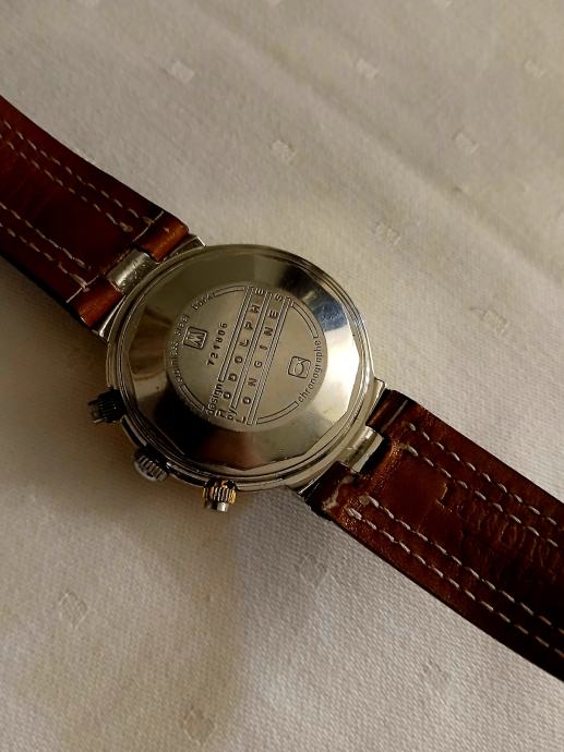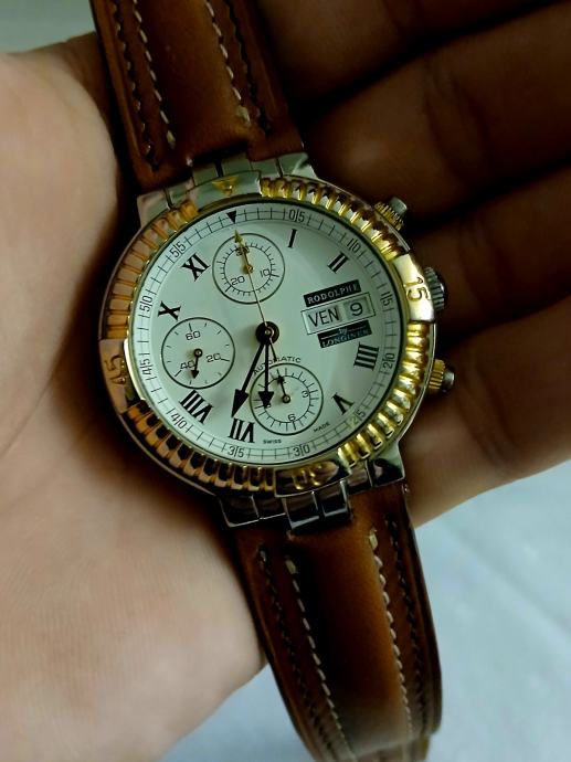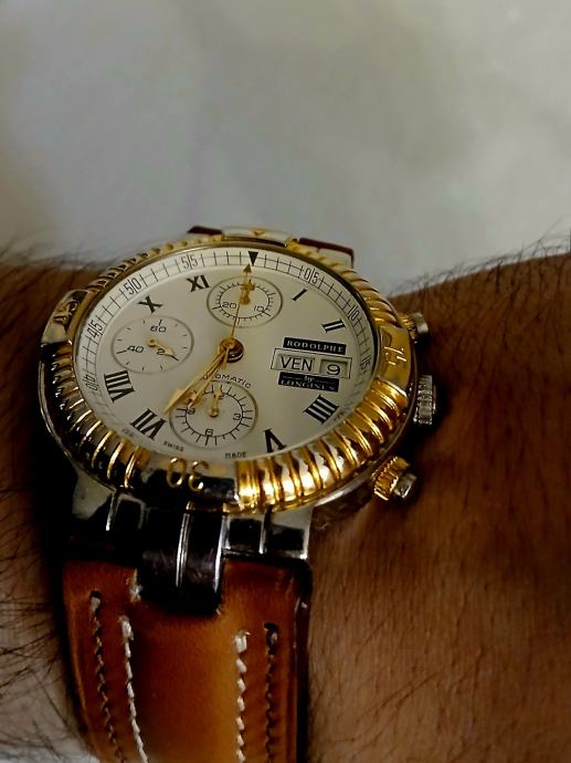 RODOLPHE by LONGINES je prava linija satova Longines koju je stvorio dizajner Rodolphe Cattin, koji sada stvara dizajne za druge VRHUNSKE satove poput Coruma na primjer... Znači sat je pravi Longines, a ne neki brand sa strane. Unutrašnjost sata je LEGENDARNI mehanizam " LONGINES VALJOUX 7750 DAY DATE ". MEHANIZAM JE SERVISIRAN PRIJE MJESEC DANA, što znači da je sat u više nego izvrsnom stanju i iznutra... točnost je IZNIMNO DOBRA, a pouzdanost je na vrhuncu. Sat ima NOVI VISOKOKVALITETNI smeđi kožni remen (prava koža je s obje strane remena). Ako imate bilo kakvih pitanja, slobodno me pitajte.