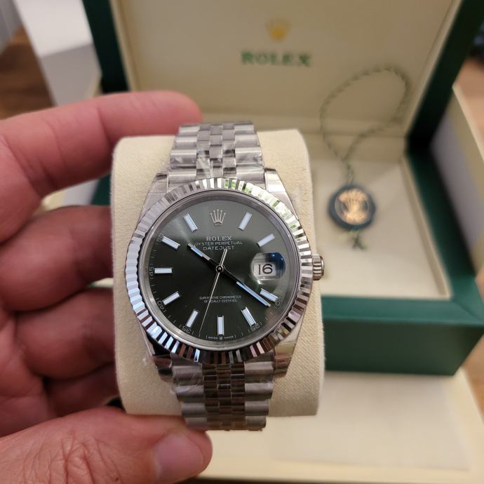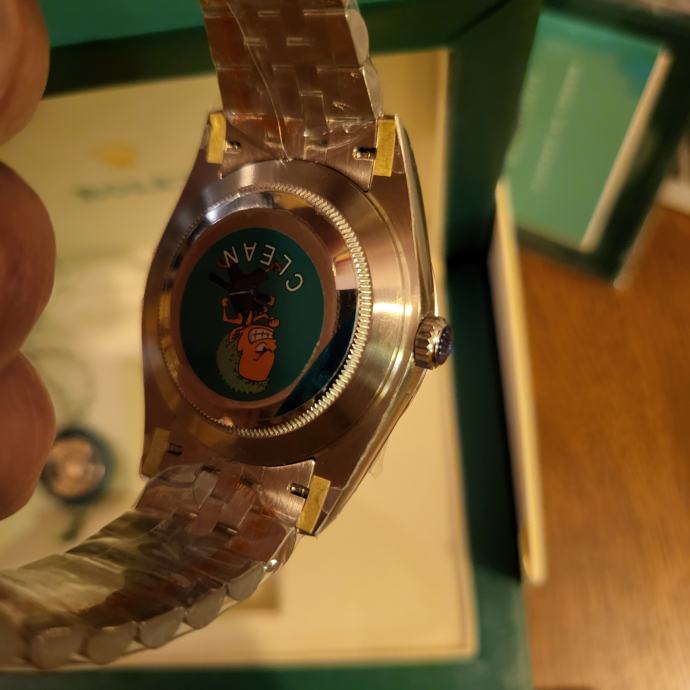 Prekrasan mint zelen dial sa lunetom od bjelog zlata,kalibrom clon 3235(clean factory),safir premaz,težina,gravure,laser krune na 6,serijski brojevi i prekrasna jubilee narukvica.Pored su još box i kartice te vrečica.Svaki sam vikend u Zg.pa ako ste interesent javite viber,whatsupp