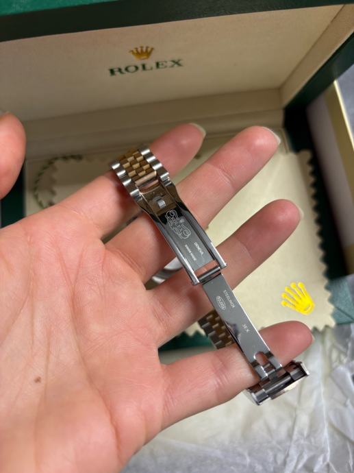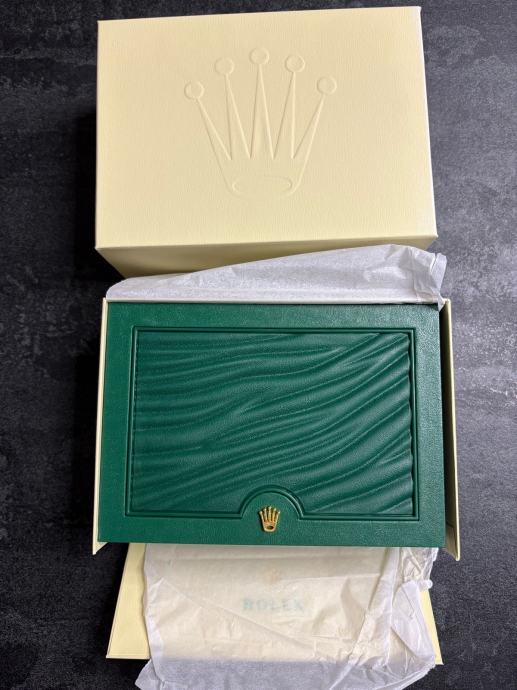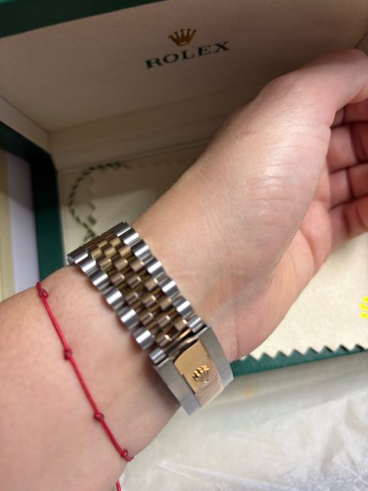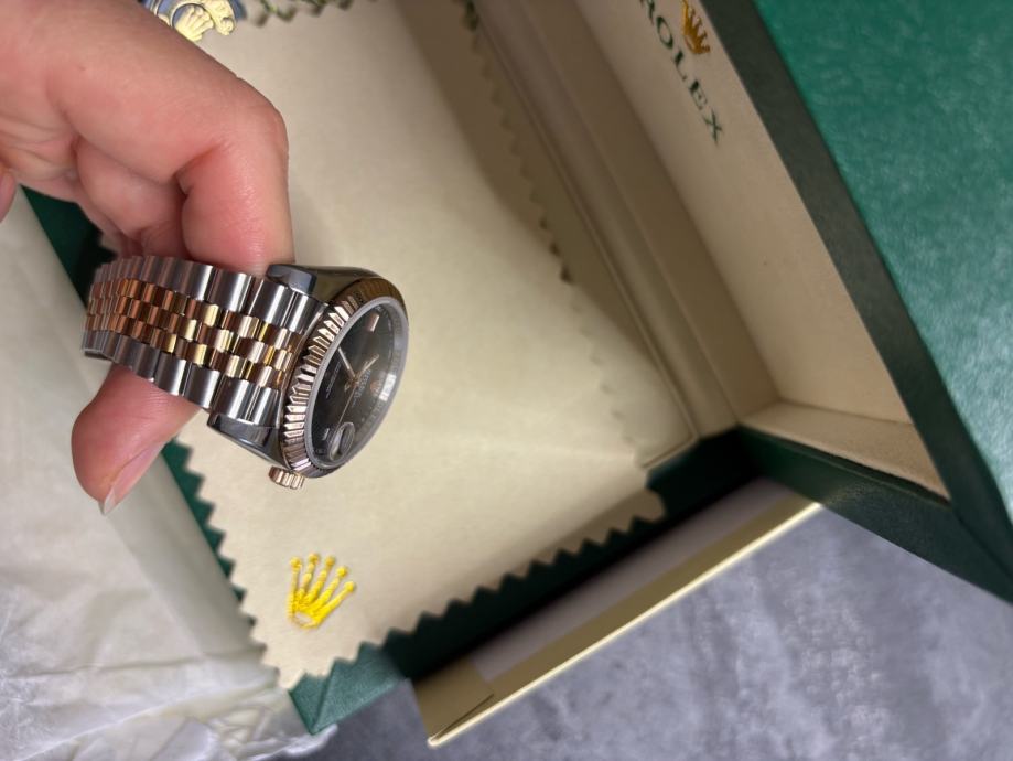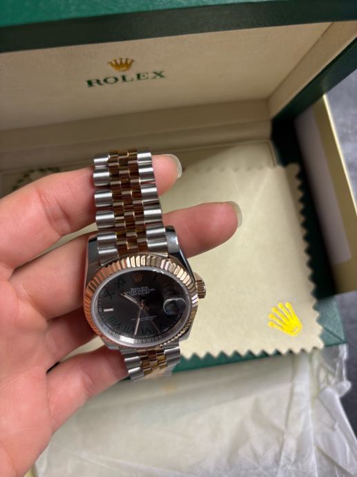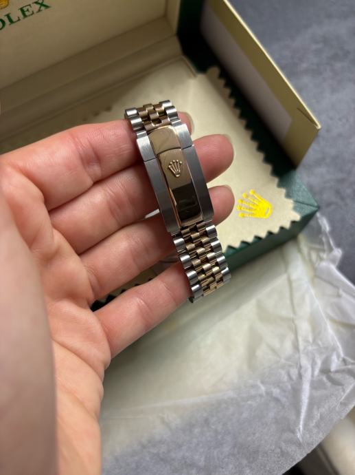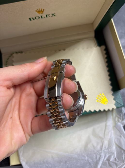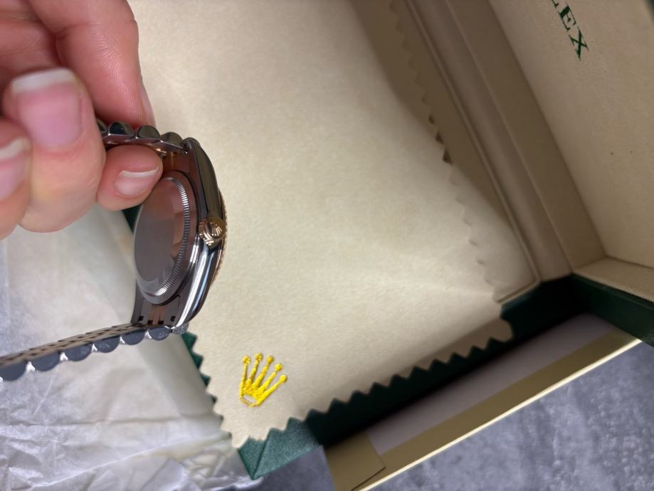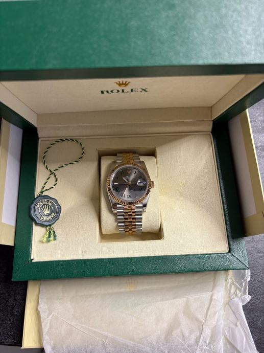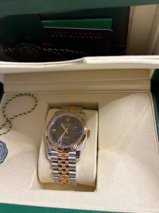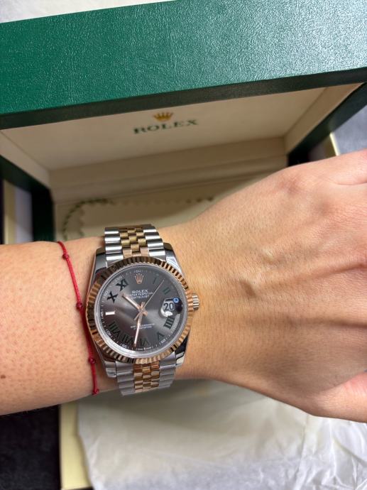 Model Datejust, potpuno nov i nikada nošen, dolazi sa kutijom i svom pratećom dokumentacijom. “Wimbledon” dizajn - sivi sa rimskim brojevima i zelenim detaljima, kombinacija rose gold i čelika, jubilee narukvica.
