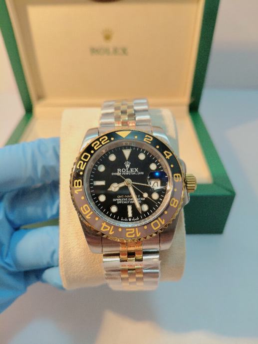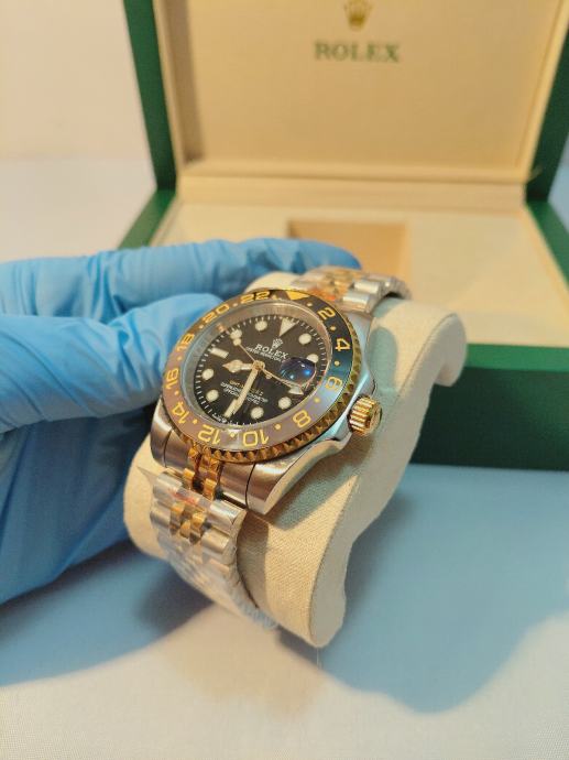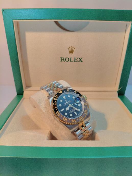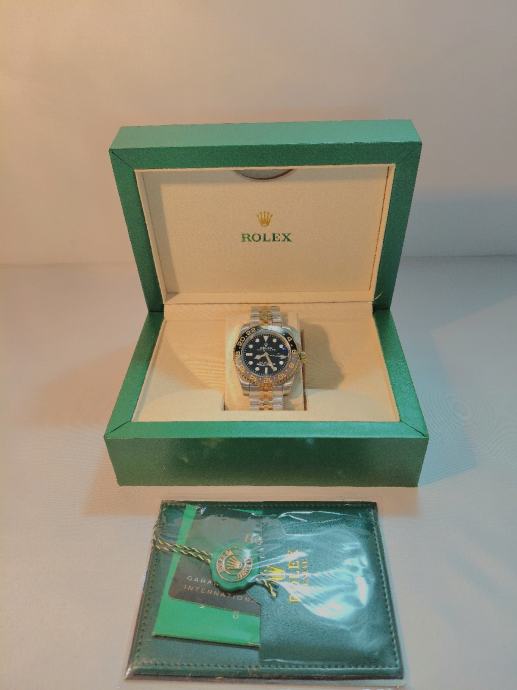 Prodajem potpuno novi Rolex GMT Master sat s etiketom u luksuznoj zelenoj kutiji. Elegantna kombinacija zlatnog i srebrnog remena savršeno nadopunjuje crnu površinu s plavim detaljima. Dolazi s kompletnom dokumentacijom i Rolex pakiranjem.