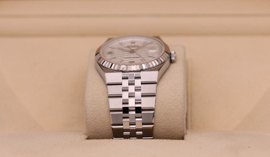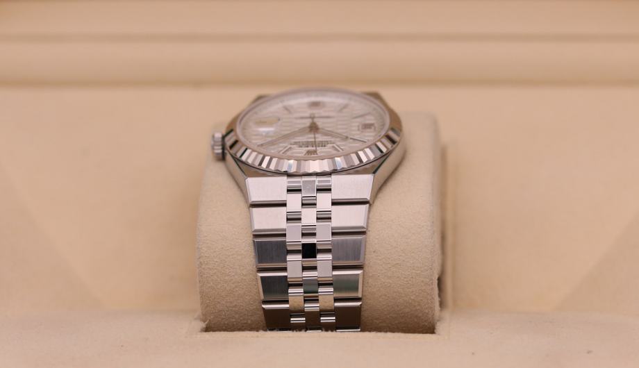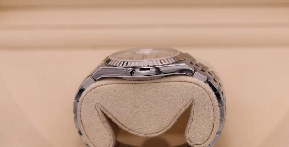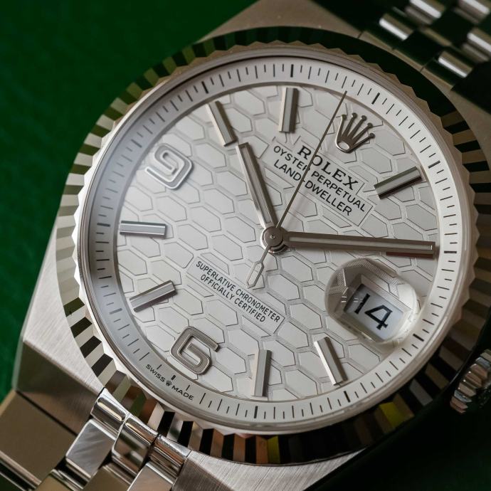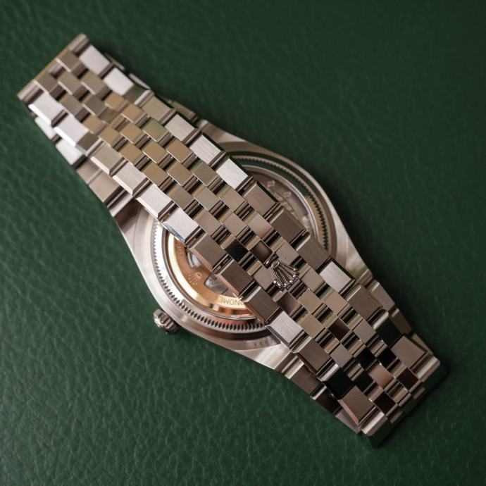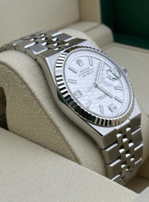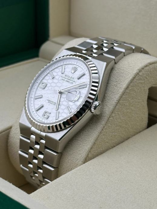 Kučište i narukvica su izrađeni od 1:1 visokokvalitetnog nehrđajućeg čelika 904L (koristi se i za izradu originala) sa kombinacijom brušenih i visoko poliranih površina. Preklopna kopča Crownclasp s uglačanim logotipom krunice Rolex. Sat ima 100% staklo od safirnog kristala s AR (antirefleksnim) premazom, koje je otporno na ogrebotine i sprječava refleksiju svjetlosti (švicarski standard, obostrani, isti kao i originalni). Rolexova žljebasta korona odražava distinkciju. Intenzivno bijeli brojčanik sa motivom saća i efektom sunčevih zraka stvara delikatan odsjaj. Superlumed brojčanik i kazaljke u ispravnoj plavoj boji, koja traje do 9h, identičan font i debljina kod svakog broja. Savršeno obrađene završne ivice ispunjene luminacijom kod kazaljki. Lasersko graviranje sa serijskim brojem, original težina sata, povečalo datuma (2,5x), ugravirana kruna u staklu na 6h. Funkcije: sati, minuti, sekunde, datum.