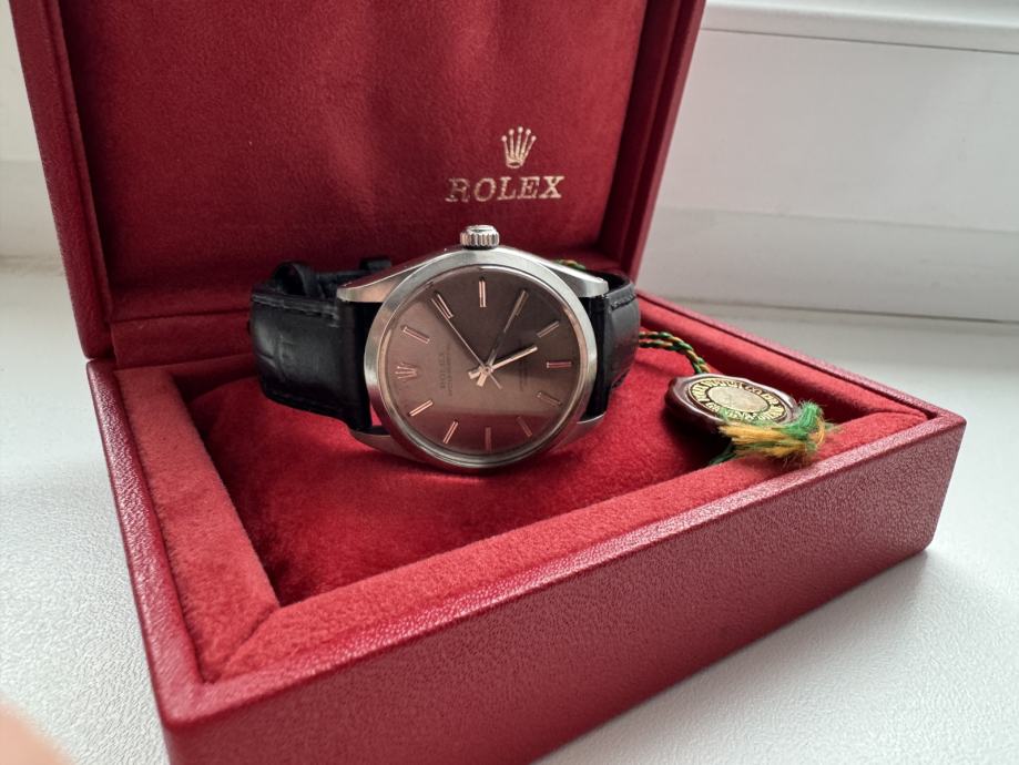 Prodajem autentičan muški Rolex Oyster Perpetual, referenca 1002 (čelik, 34mm), proizveden oko 1970. godine. Sat je u izvrsnom vintage stanju s unikatnom patinom na brojčaniku koja mu daje traženi "Tropical" izgled.