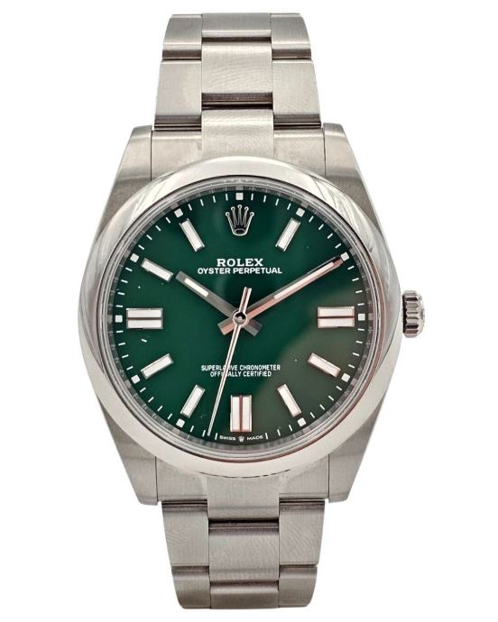 Rolex Oyster Perpetual 41 sa zelenim brojčanikom predstavlja jednu od najtraženijih modernih Rolex referenci poslednjih godina. Model 124300 u veličini od 41mm donosi savremen izgled, čist dizajn i prepoznatljivu Rolex pouzdanost u najminimalističkijoj formi.