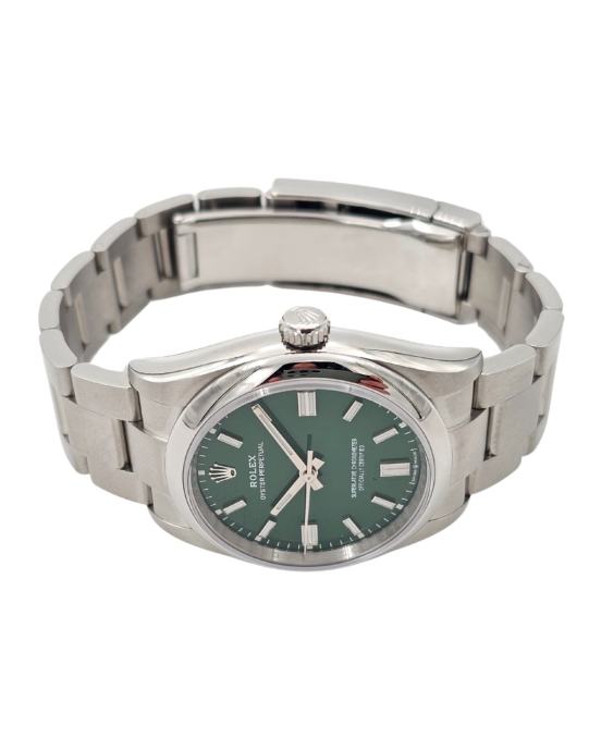 Kućište je izrađeno od Oystersteel čelika, poznatog po izuzetnoj otpornosti na koroziju i dugotrajnom sjaju. Sat pokreće manufakturni automatski kalibar 3230, sa rezervom snage od približno 70 sati i Chronergy escapement sistemom koji garantuje visoku preciznost i stabilnost rada. Intenzivni zeleni brojčanik daje modelu snažan vizuelni identitet i čini ga izuzetno atraktivnim kako za kolekcionare, tako i za ljubitelje modernog luksuza. Zahvaljujući jednostavnom prikazu bez datuma, Oyster Perpetual zadržava čist i simetričan dizajn, što dodatno doprinosi njegovoj eleganciji. Oyster narukvica sa preklopnom Oysterclasp kopčom i savršeno balansirane proporcije čine ovaj model idealnim izborom za svakodnevno nošenje.