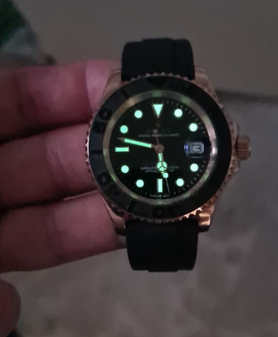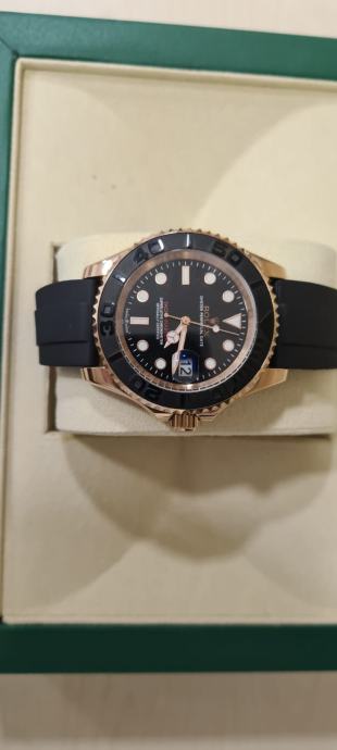 Prodajem repliku Rolex Yacht-Master sata. Kućište i narukvica su u rose gold boji, s crnom keramičkom lunettom i crnom gumenom narukvicom tipa Oysterflex. Brojčanik je crne boje s indeksima u boji rose golda. Sat dolazi sa ili bez kutije(60).Automatic i vodootporan je.