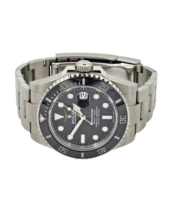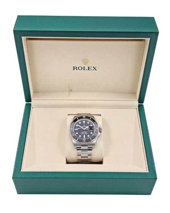 Kućište prečnika 41 mm, izrađeno od Oystersteel čelika, kombinuje robusnost i eleganciju, dok crni Cerachrom bezel sa belim gravurama pruža izuzetnu otpornost na ogrebotine i izbleđivanje. Crni ciferblat sa velikim luminescentnim markerima omogućava savršenu čitljivost u svim uslovima, a datum sa Cyclops lupom na poziciji tri sata ostaje jedan od zaštitnih znakova Submariner kolekcije.