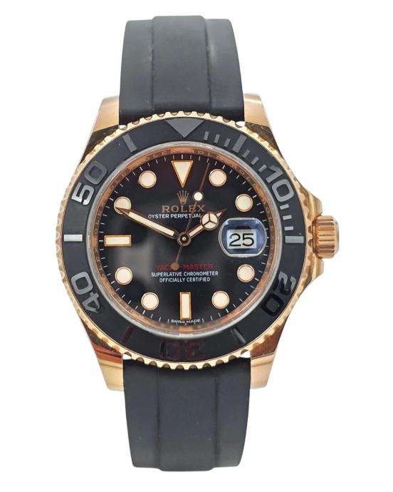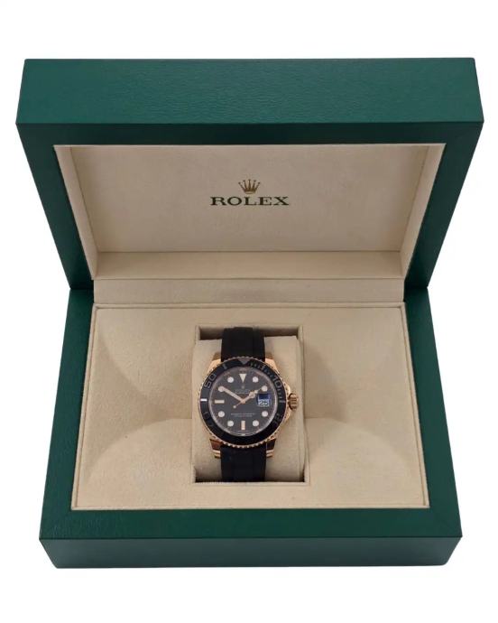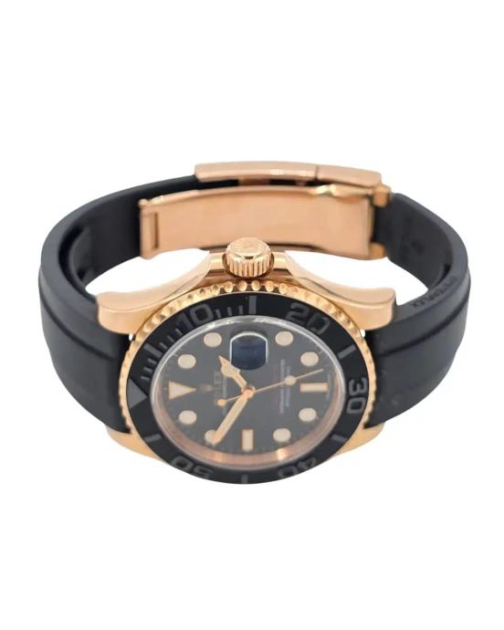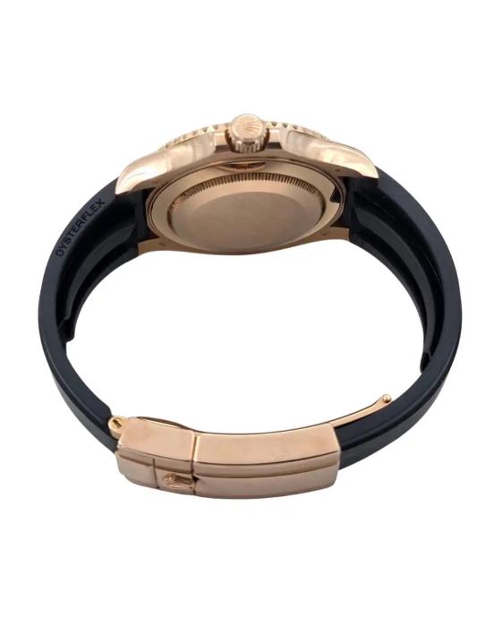 Rolex Yacht-Master 40 referenca 116655 predstavlja savršen spoj sportskog duha i luksuzne izrade. Kućište prečnika 40 mm izrađeno je od 18k Everose zlata, Rolexove ekskluzivne legure poznate po dugotrajnoj boji i otpornosti. Crna Oysterflex gumena narukvica sa fleksibilnim metalnim ojačanjem pruža izuzetnu udobnost, stabilnost i moderan izgled. Sat je opremljen rotirajućom bezelom od mat crne Cerachrom keramike sa poliranim brojčanim oznakama, što omogućava odličnu čitljivost i prepoznatljiv dizajn. Tamni brojčanik sa svetlećim indeksima i kazaljkama garantuje jasno očitavanje vremena u svim uslovima.