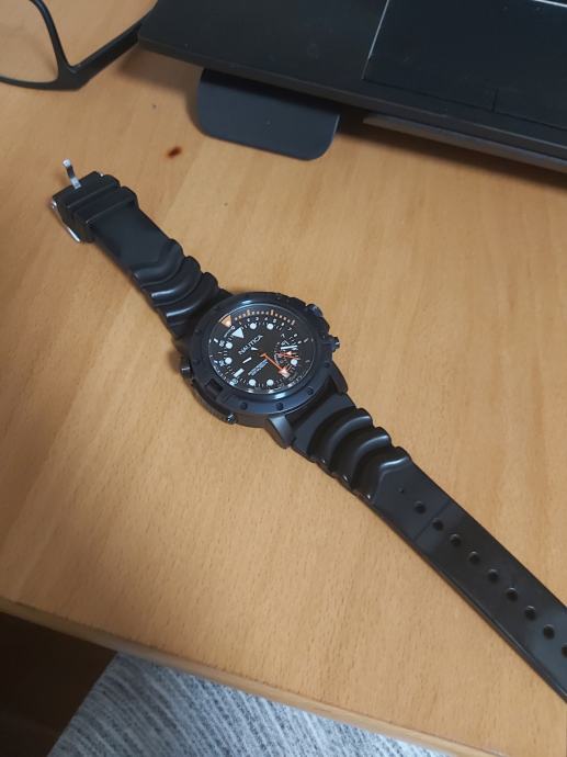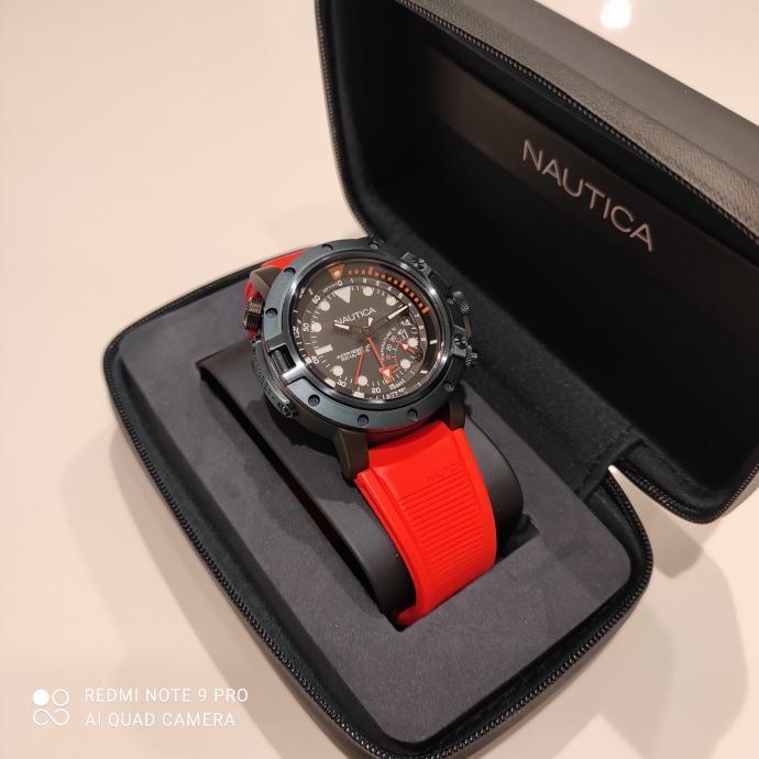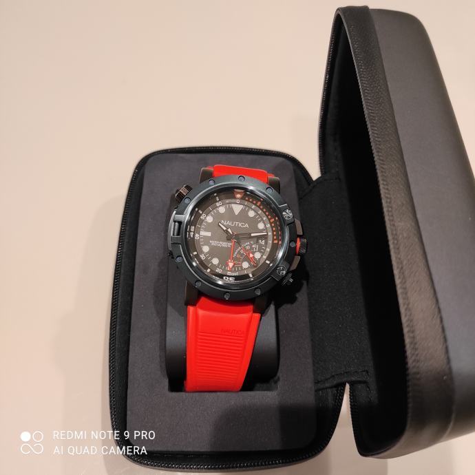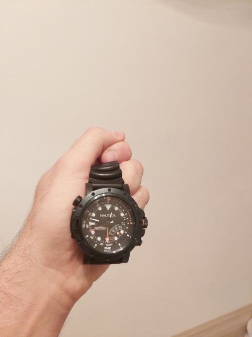 Prodajem sportski sat marke Nautica iz Porthole Dive kolekcije s funkcijom termometra i dubinomjera. Čelično kućište promjera 48 mm je crne boje sa tamnoplavom podlogom. Vodootporan je do 200 m. Za ronjenje je odličan!! Promjenjen je remen jer je originalni bio preslab u odnosu na težinu samog sata.