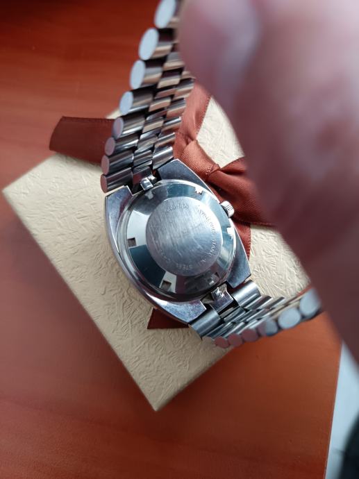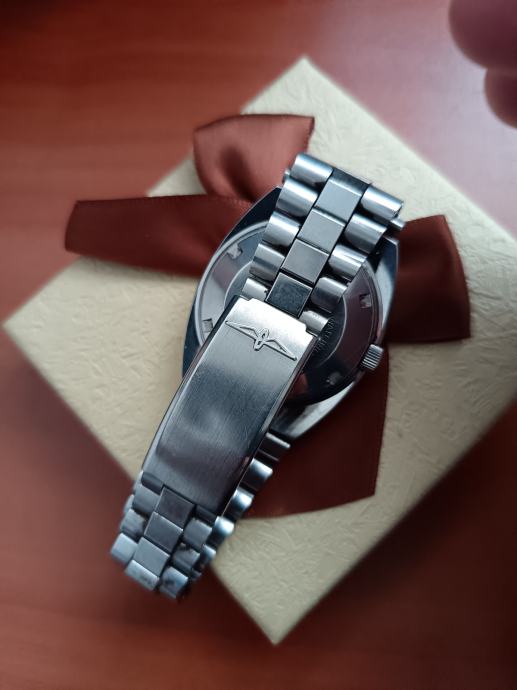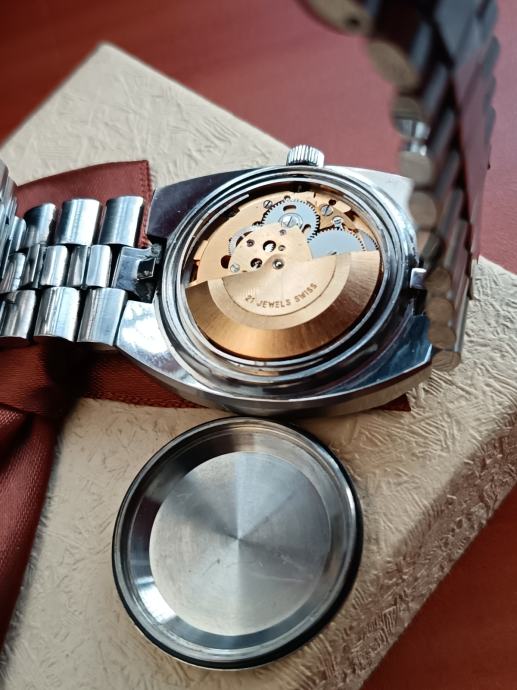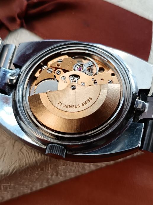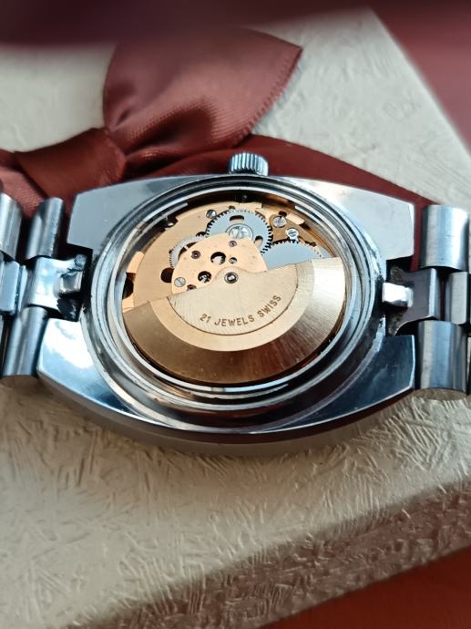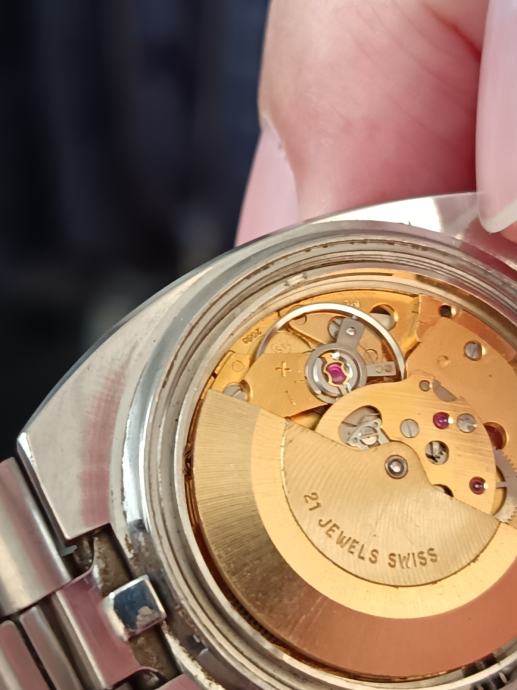 Kvalitetan i pouzdan automatski ETA mehanizam AS 2066. Satni mehanizam u zlatnoj boji ugrađivan je samo u najkvalitetnijih proizvođača u ono vrijeme čak su i Omega mehanizmi više imali bakrenu boju. Ovakav kvalitetan metal vidio sam kod nekih Favre leuba automatik satova i ovdje.