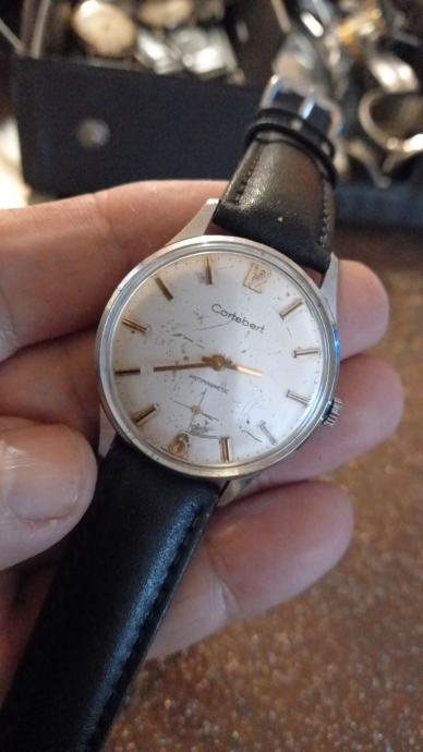 Prodajem rabljeni ručni muški sat marke Cortebert. Radi se o vintage modelu s bijelim brojčanikom, zlatnim indeksima i kazaljkama te crnim kožnim remenom. Kućište je srebrne boje, a sat ima i mali sekudni brojčanik (sekundaš) te datumski prozorčić. Mehanički sat koji svojom klasičnom estetikom odaje dojam starije švicarske izrade.Sat radi