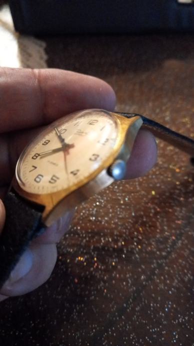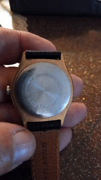 Prodajem rabljeni ručni muški sat s elegantnim zlatnim kućištem i crnim kožnim remenom. Brojčanik je bijele boje s jasno čitljivim arapskim brojevima Sat ima 17 dragulja u mehanizmu. Stražnja strana kućišta izrađena je od metala s ugraviranjem.Sat radi