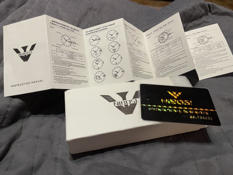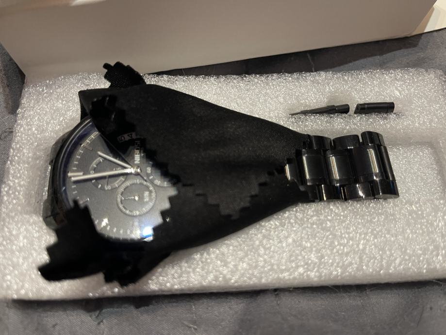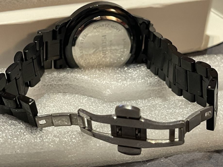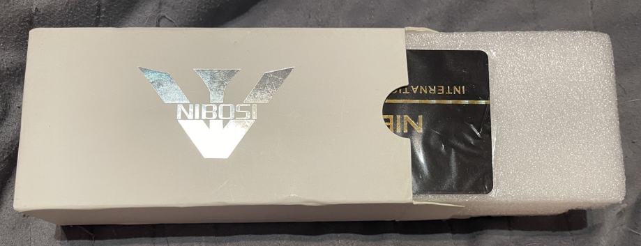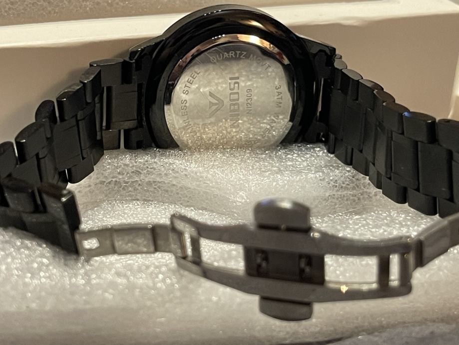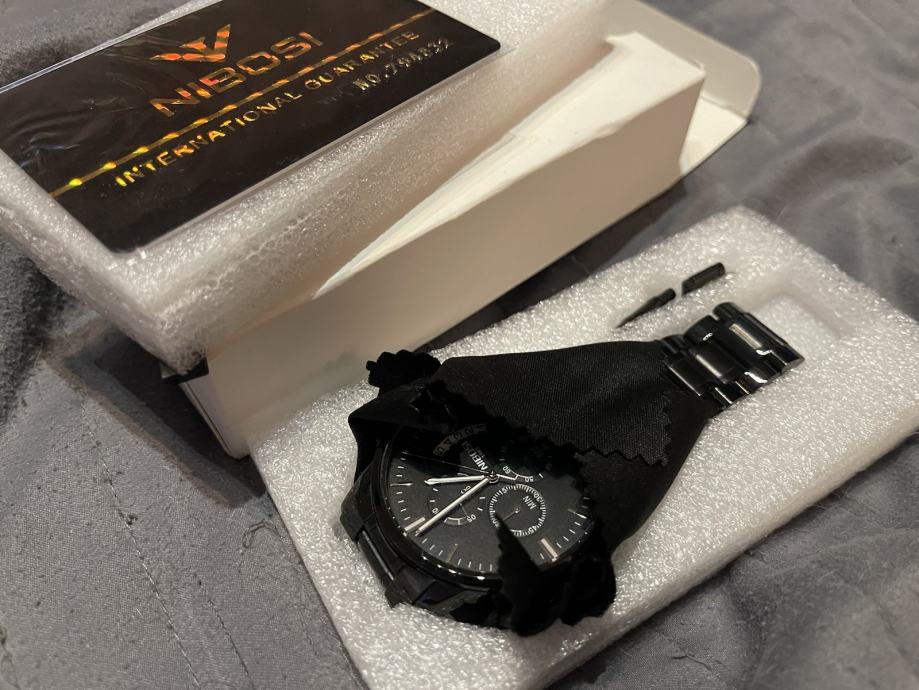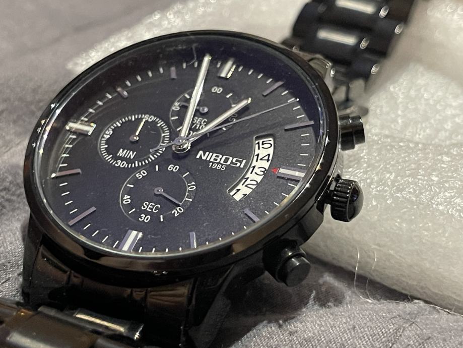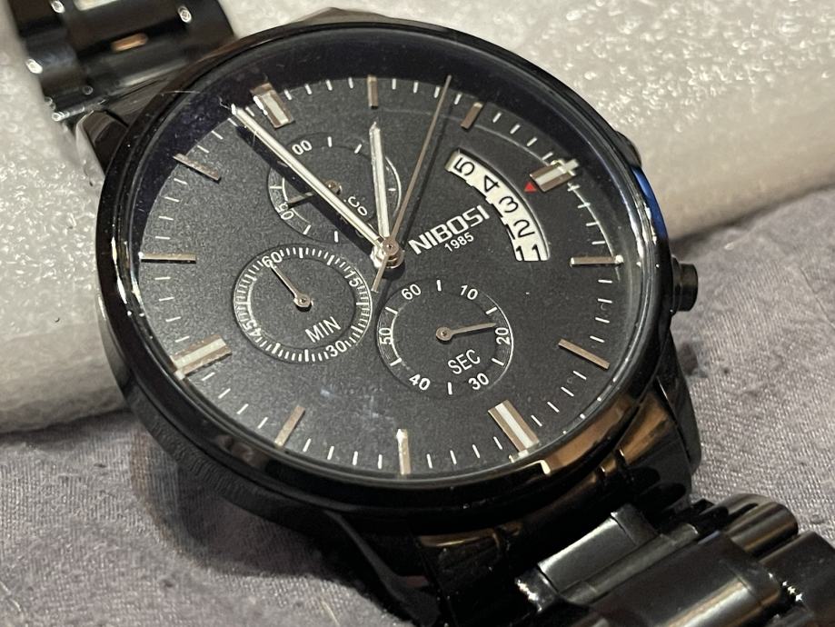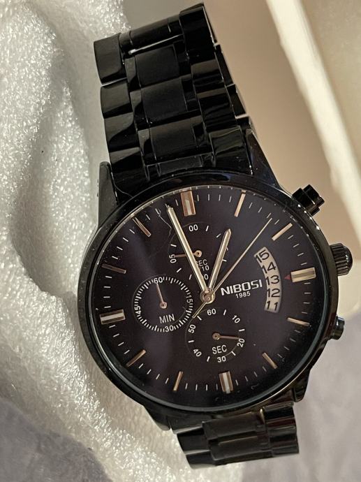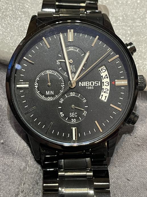 Ručni sat Nibosi. Quartz. Hommage Tag Heuer. Crni čelik. Crna čelična narukvica sa leptir zatvaranjem (skrivena kopča). Datum, štoperica. Sa originalnom ambalažom i svim pripadajućim sitnicama. Novo