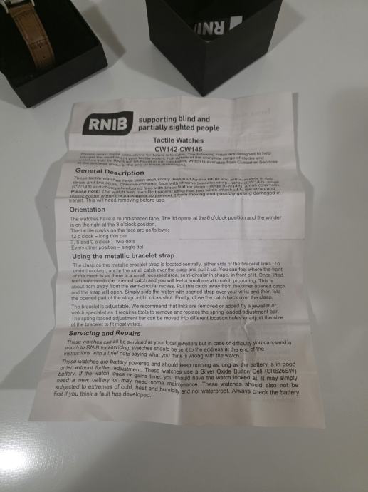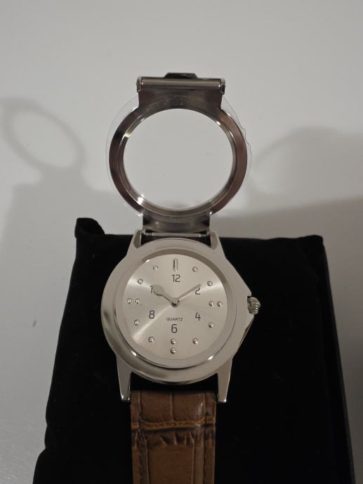Prodajem poseban ručni sat dizajniran za slabovidne osobe. Karakterizira ga izuzetno pregledan brojčanik s velikim, jasnim brojkama i naglašenim kazaljkama visokog kontrasta (crno na srebrnoj podlozi).