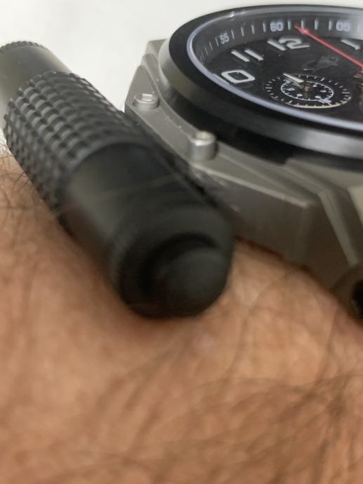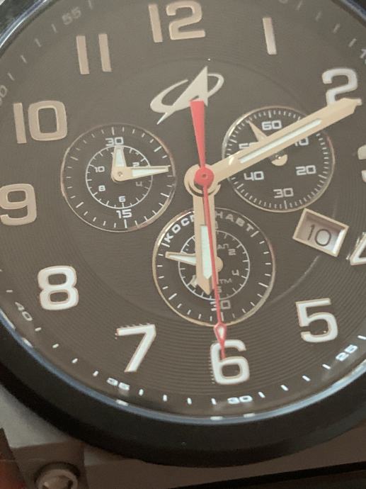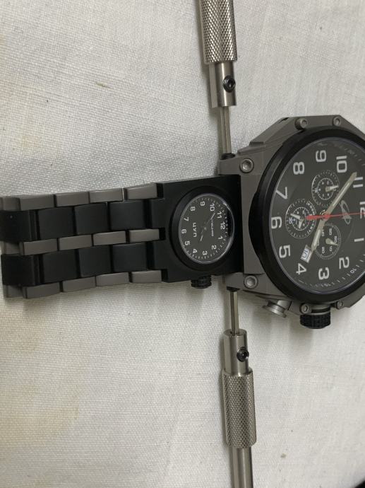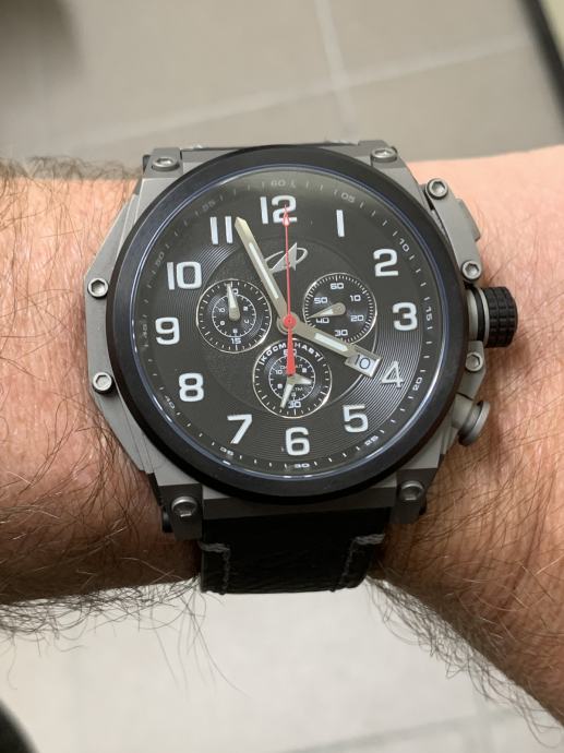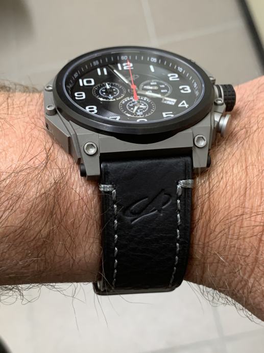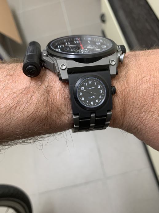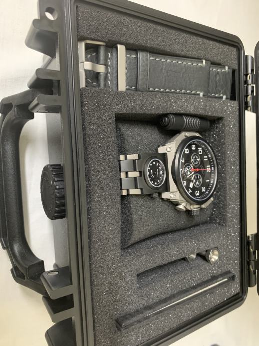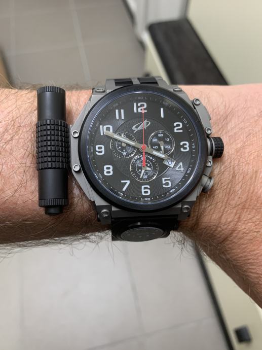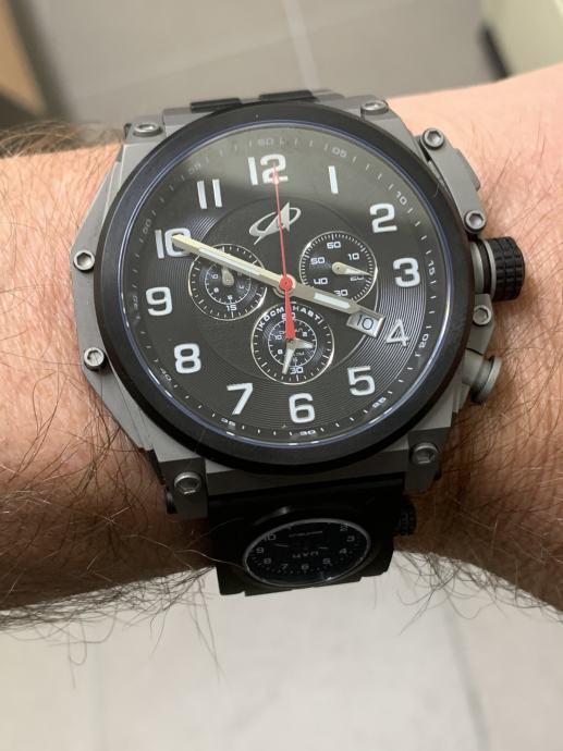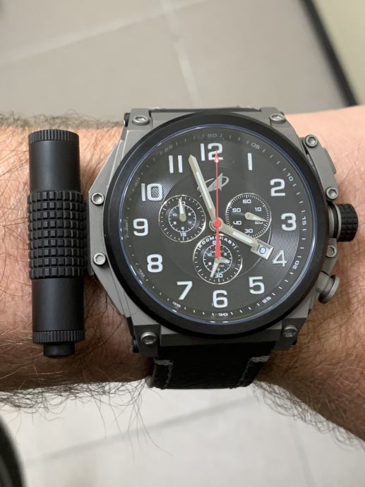 Promjer sata od 50 mm je ogroman (mjereno naravno bez krunice, zaštite krunice i tipki na desnoj strani sata), PLUS svjetiljka na lijevoj strani sata i zaštita krunice dodaju dodatnih skoro 1,6 cm. Osim toga, na narukvici se nalazi još jedan dodatni sat... Ipak, dobra stvar je što sat nije predebeo, ima samo 12 mm, što ga čini malo normalnijim. Svjetiljka se lako skida bez ikakvog alata – dovoljno je pritisnuti mali gumb i izvući svjetiljku unatrag. Jednostavno. U paketu dobivate dodatni kožni remen i alat za zamjenu narukvice remenom. Zamjenom narukvice remenom uklanja se i drugi sat, jer je on integriran u narukvicu. Nakon ova dva koraka dobivate kronograf koji je i dalje velik, ali sada normalno nosiv i može se koristiti kao svakodnevni sat. Također dobivate NATO velcro/kožni remen, koji je ogroman i očito namijenjen korištenju kada se sat nosi preko svemirskog odijela. Vrlo korisno :)