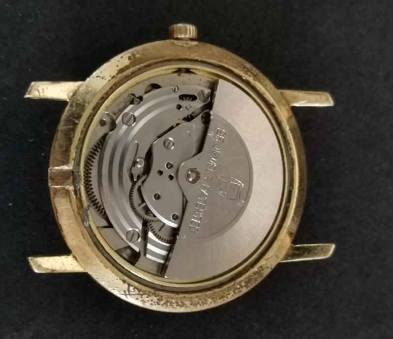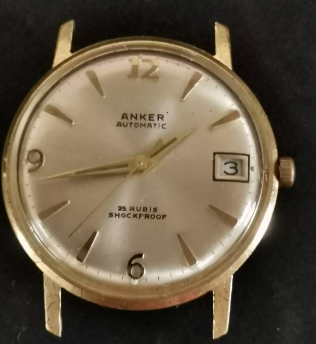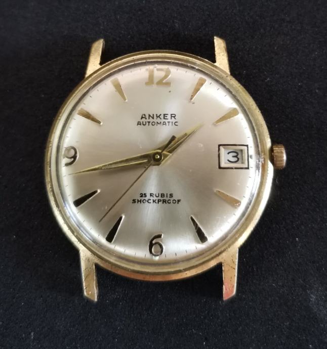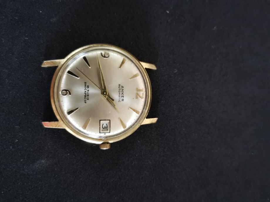 Vintage pozlaćeni "ANKER" AUTOMATIC" 25 RUBIS..1975. godina.>WEST GERMANY..mehanizam FERSTER 222..f=21600 A/h..rezerva snage 38h..mainspring opruga..incabloc.. promjer 34 mm bez krunice i lugova.
