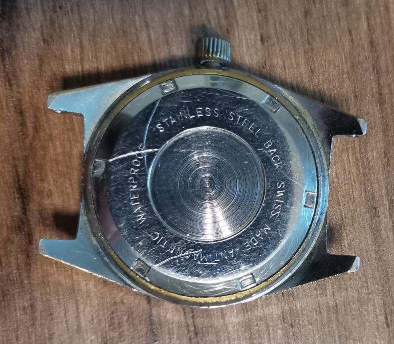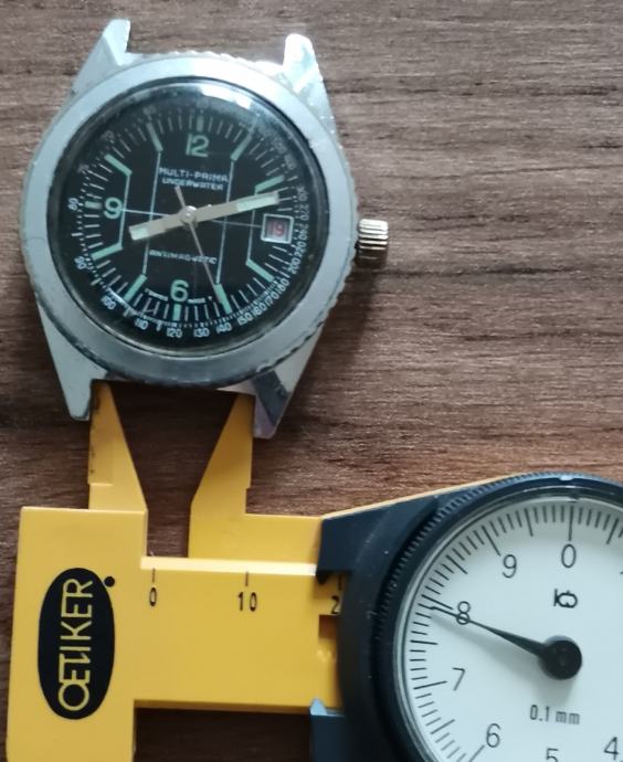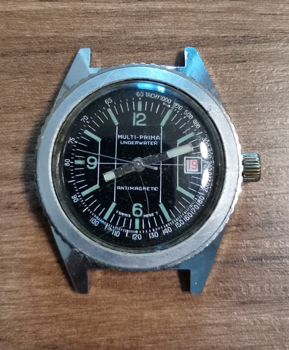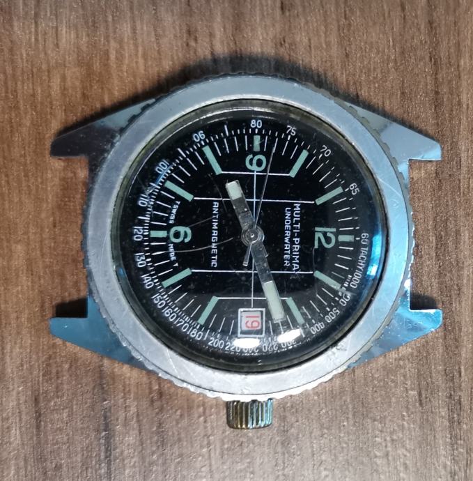 RONILAČKI SAT "MULTI-PRIMA" SWISS MADE...UNDERWATER, ANTIMAGNETIC...,mehanizam EB 8810 ..čelično kućište, rotirajuća luneta, poklopac na navoj...crni cifer...perfektna iluminacijaq od tricija...promjer 37 mm bez krunice i lugova.....promjer sa krunicom 40 mm...debljina 11 mm...širina prihvata remena 18 mm..dobro očuvan...mehanizam ispravan i sekundna kazaljka radi...ali minutna kazaljka zna stati...potrebit servis...