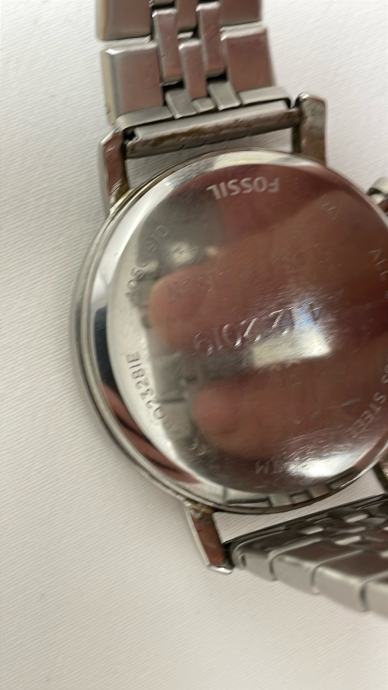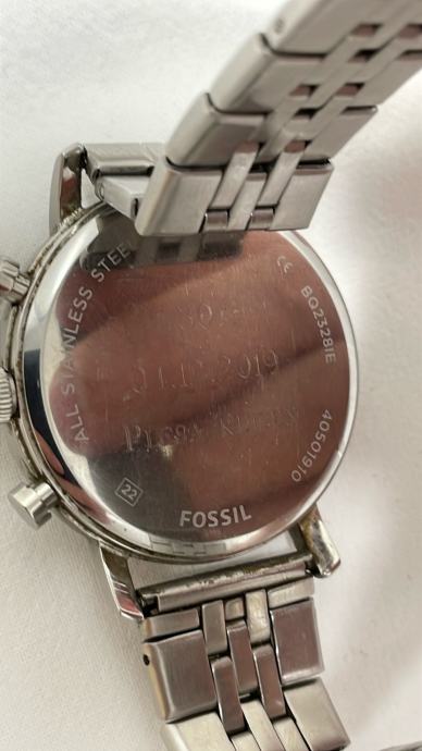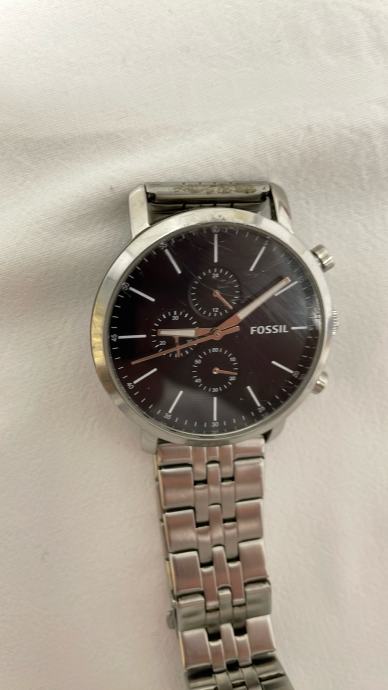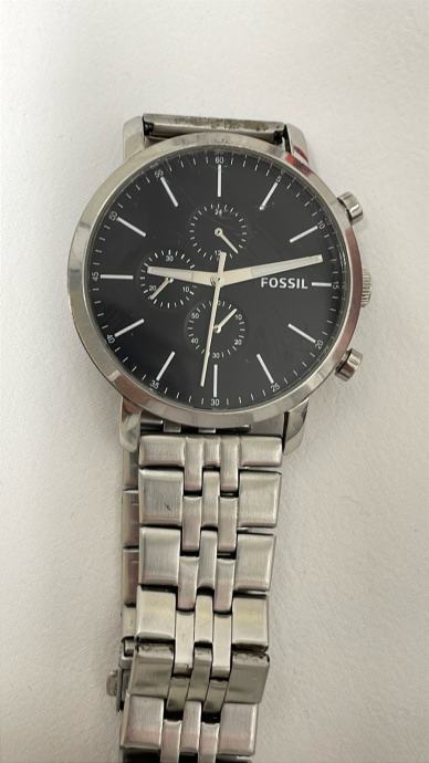 Prodajem muški sat marke Fossil s metalnom narukvicom srebrne boje. Sat ima crni brojčanik s dva manja kruga za kronograf funkciju i elegantnim srebrnim detaljima. Kućište je srebrno, a sat dolazi s metalnom narukvicom u istoj boji s karakterističnim uzorkom karika. Sat je ispravan i radi točno.