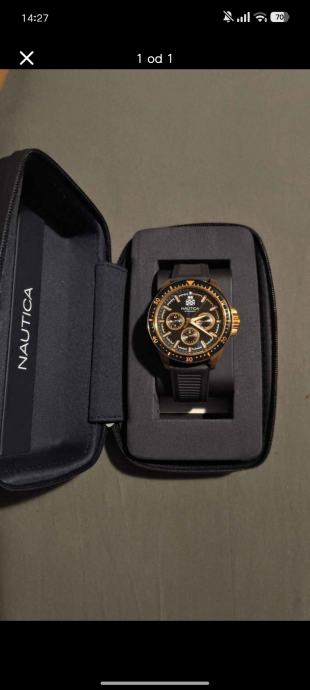 Prodajem muški sat marke Nautica. Sat dolazi u originalnoj kutiji s logotipom brenda. Brojčanik je zlatne boje s detaljima, a sat ima plavu gumenu narukvicu. Vidljiv je sportski dizajn karakterističan za Nauticu.