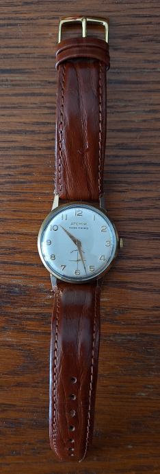 Pozlata 30 mikrona rose zlato, dimenzije 36 mm. Pleksi staklo zamijenjeno prije nekoliko godina, zadnji servis prošle godine, sat je iznimno precizan, a poklonjen je na Dan republike 1968 za odlazak u mirovinu. Vidljiva sitna oksidacija na ciferblatu i cajgeru, ništa funkcionalno.