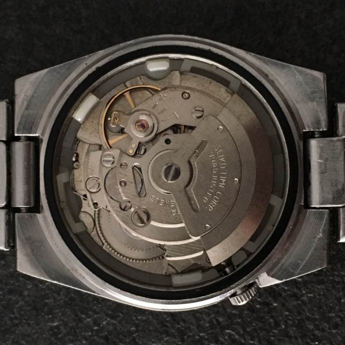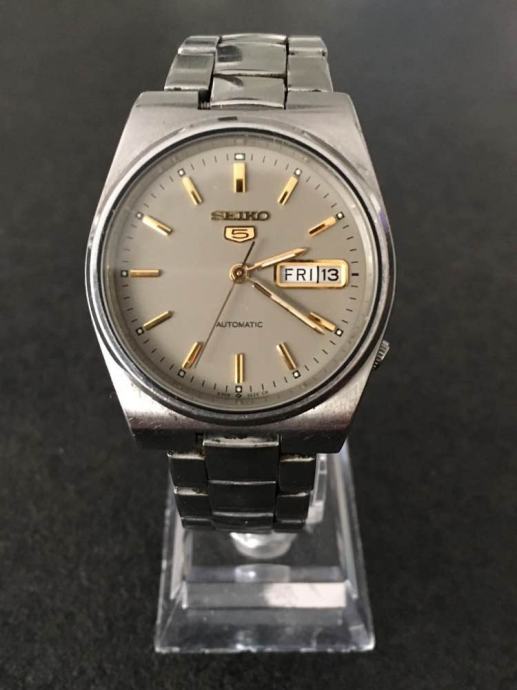 Seiko 5 Automatic na steinless narukvici, 36 mm u promjeru bez krune. Dan, datum komplikacija na engleskom i njemačkom. Zlatni satni markeri i kazaljke. Ref. broj 6309-8350.