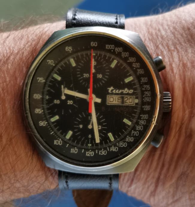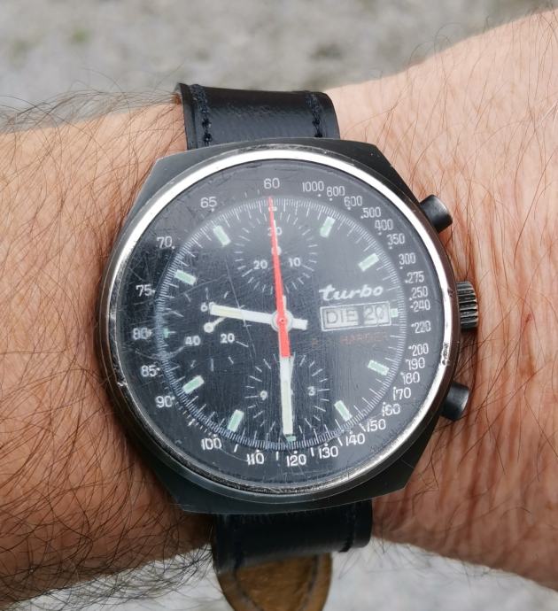 VINTAGE PORSCHE DESIGN "TURBO" CHRONOGRAPH...black PVD...kućište Passadena stil..mehanizam VALJOUX 7750-17 jewels-SWISS...f= 28800 A/h..rezerva snage 42. h...1981. godina....limitirano izdanje za Kraljevsku kanadsku konjičku policiju (B:J HARDER) Sat kupljen od urara, mehanizam servisiran i u top stanju, sve funkcije rade uredno...Promjer 43x42 mm bez krunice i pushera, debljina 14,7 mm, širina lugova za prihvat remena 19 mm..staklo ima ogrebotina...