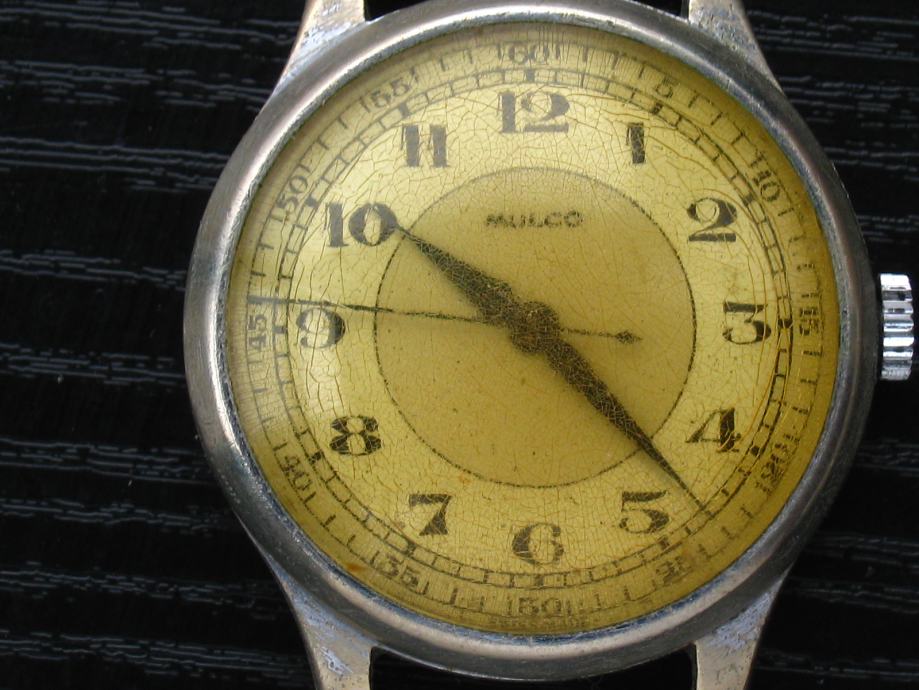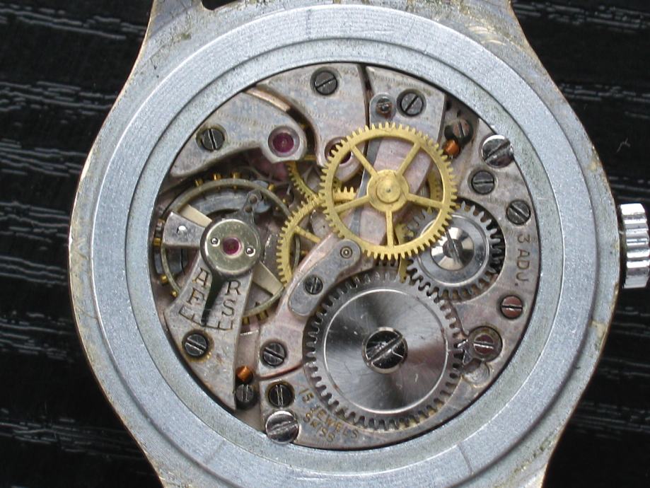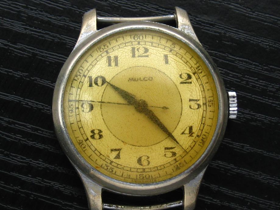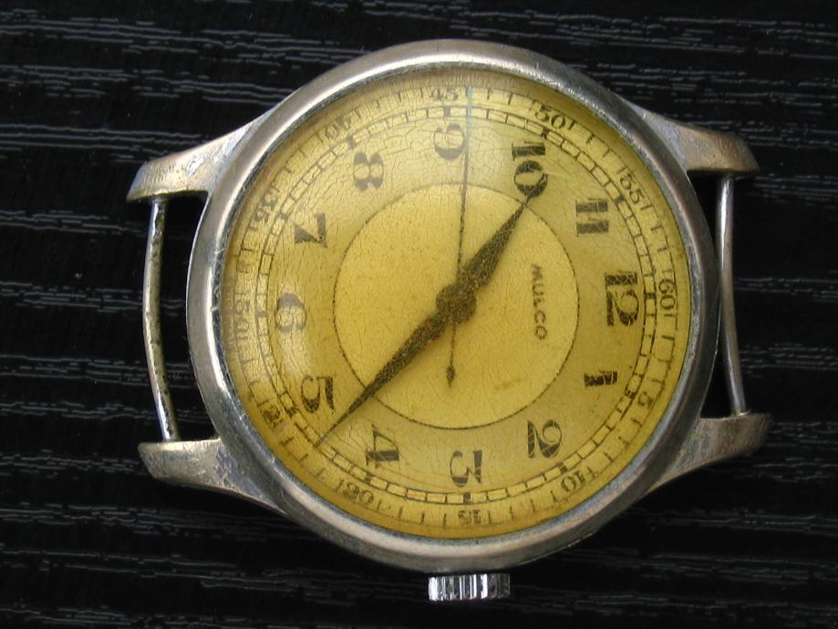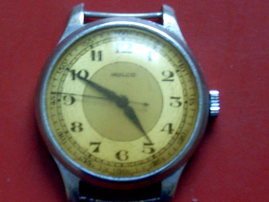 Vrhunski vojni WW2 sat "MULCO" SWISS-15 jewels-3 ADJ-koristili ga saveznički piloti u WW2...čelično kućište promjera 33 mm bez krunice, debljina 11 mm, fiksirane poteznice, vojna krunica...Mehanizam visoke kvalitete koje se ugrađivao i u IWC -GALLET ELECTA SAVONNETTE (Julien Gallet-Gallet@Cie, La Chaux de Fonds)...modificirana rijetka varijanta s centralnom sekundarom...prirodni crveni rubini umjesto sintetičkih, što je odlika mehanizama top razreda -(Electa katalog iz 1914. god),,,sat u potpuno originalnom i dobro očuvanom stanju....potrebit popravak mehanizma-osovina u redu...
