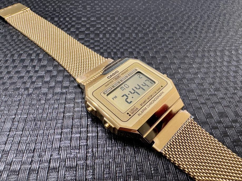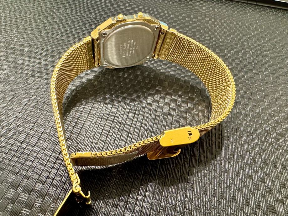 Prodajem Casio Retro sat u zlatnoj boji, model A700WEMG-9AEF. Sat je nov, dolazi s elegantnom mrežastom narukvicom od nehrđajućeg čelika u zlatnoj boji. Digitalni zaslon s retro dizajnom koji je prepoznatljiv za ovu Casio seriju. Klasični pravokutni oblik kućišta sa svim osnovnim funkcijama – sat, datum, alarm, štoperica i pozadinsko osvjetljenje. Narukvica ima sigurnosnu kopču za jednostavno podešavanje veličine.