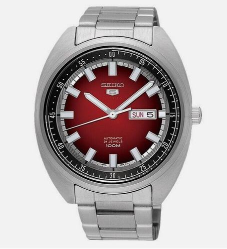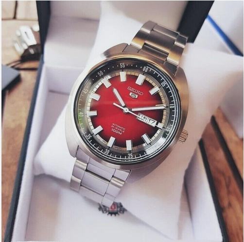 Seiko Model 5 Sports, Referenčna številka SRPB17K1, Mehanizem automatic, Material ohišja Jeklo Stanje (mint) Mehanizem Samodejni Kaliber/4R36 Število draguljev 24, Premer ohišja 46 x 13 mm, Številčnica Rdeča.