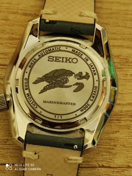 To je custom izvedba Marinemastera koji košta nekoliko tisuća eura. Mehanizam Seiko NH35 automatik. Poklopac specijalno graviran u Nizozemskoj. Staklo safirno, novi vrhunski kožni remen.